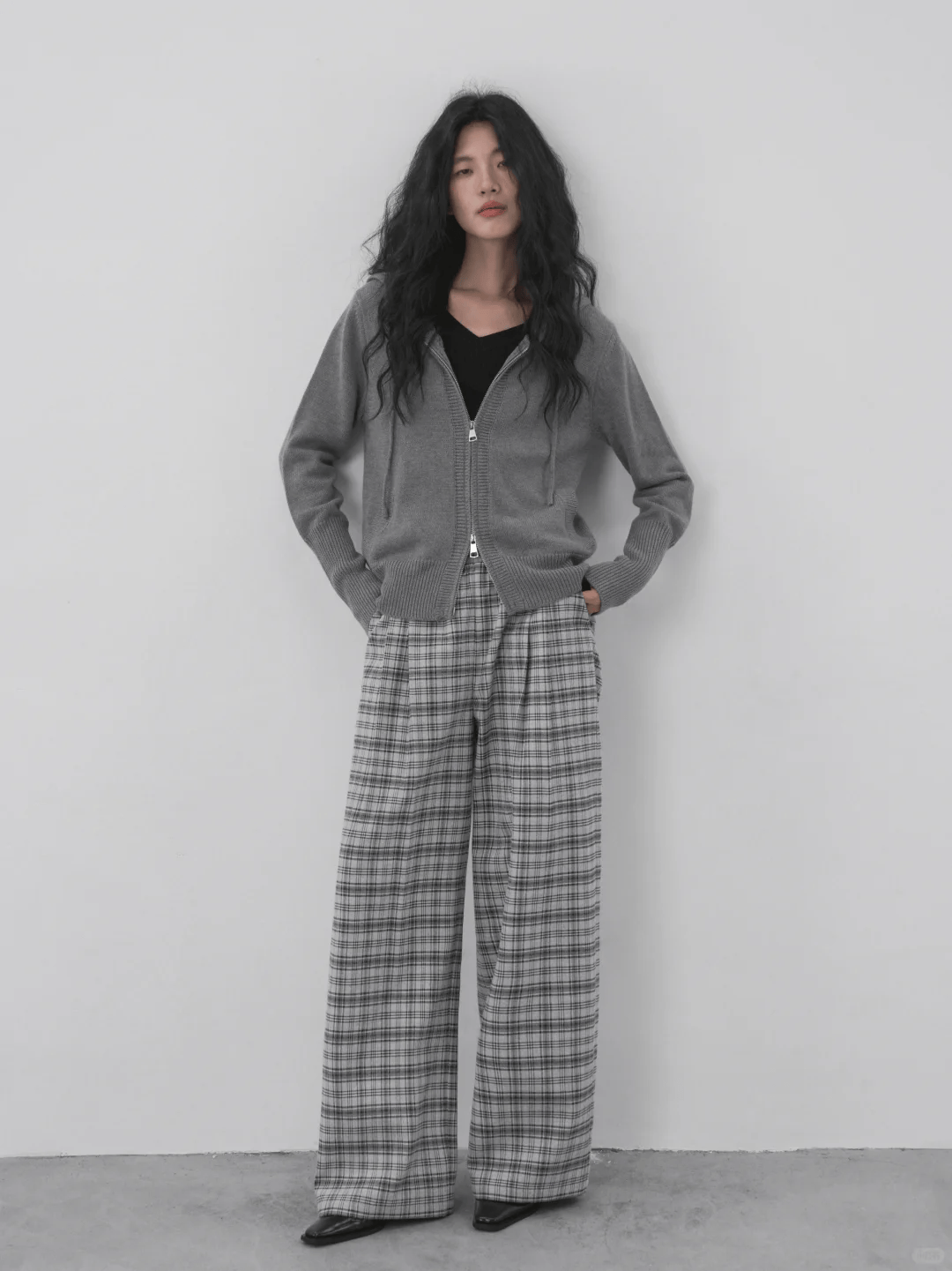 灰色阔腿裤:选垂坠感强的面料(比如羊毛或真丝混纺),搭配短款羽绒服或大衣,“上短下长”的比例显高又显瘦,像周雨彤那样用“黑色短羽绒配灰色阔腿裤”,成为现象级穿搭不是没道理的。