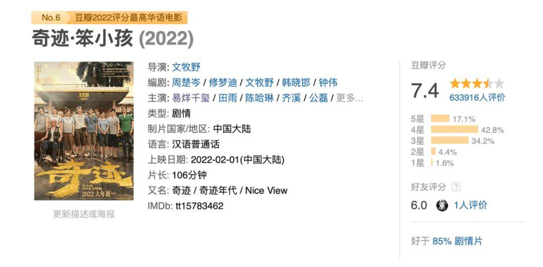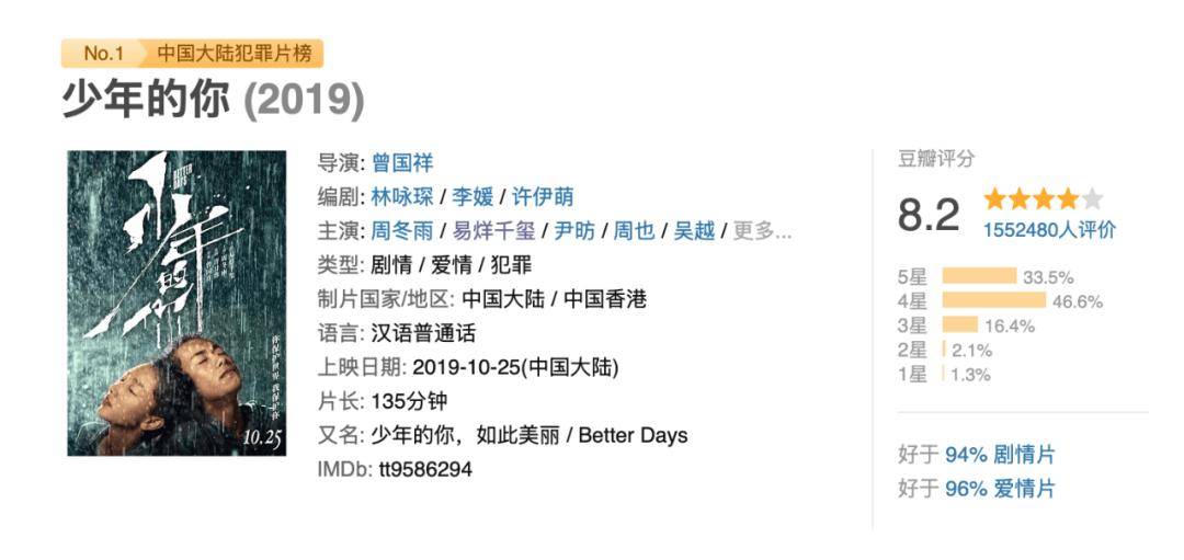- 口碑保障:豆瓣评分均值7.0+,《少年的你》8.2分位列中国大陆犯罪片榜首。