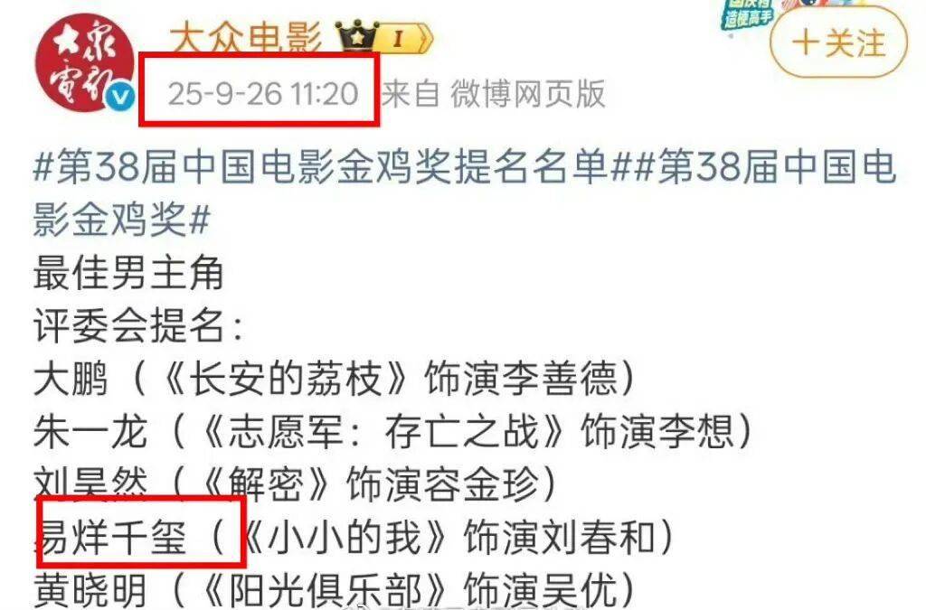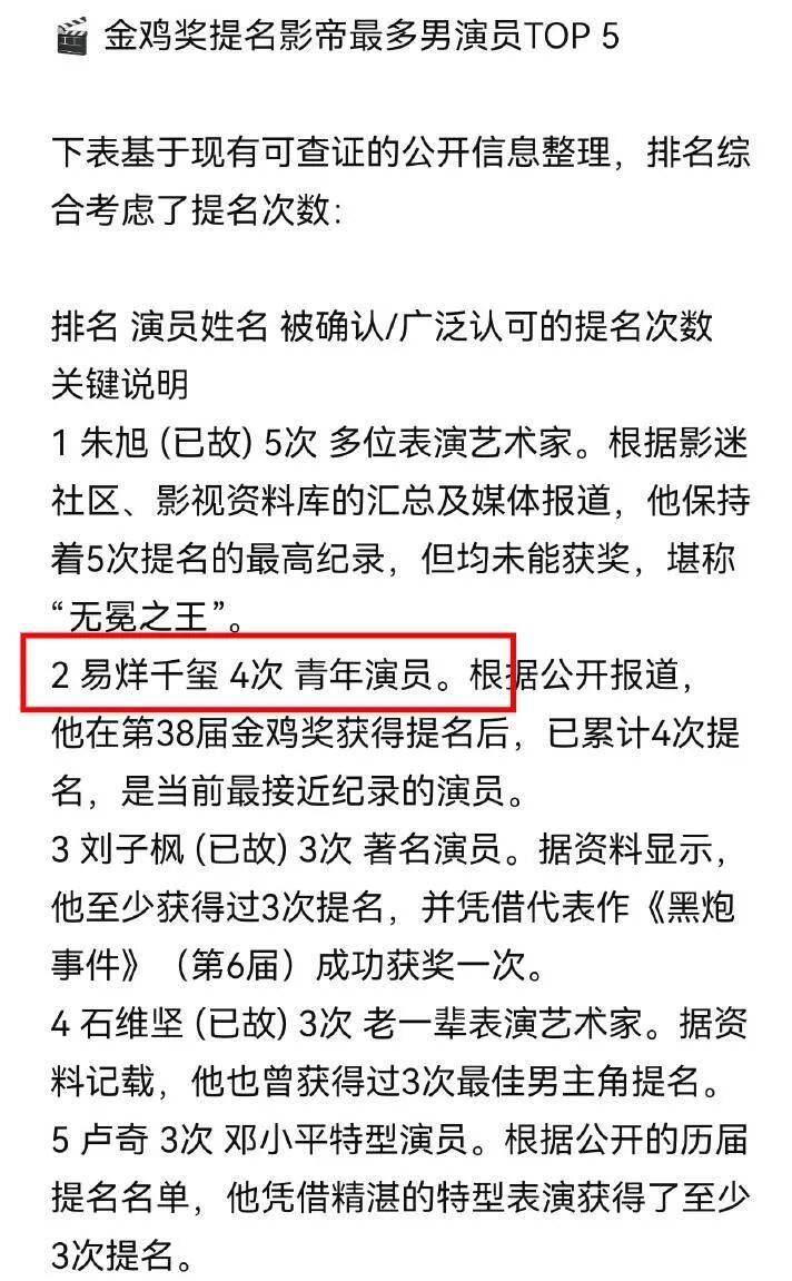 易烊千玺此次封帝堪称“苦尽甘来”。他此前已三次提名金鸡奖最佳男主角: