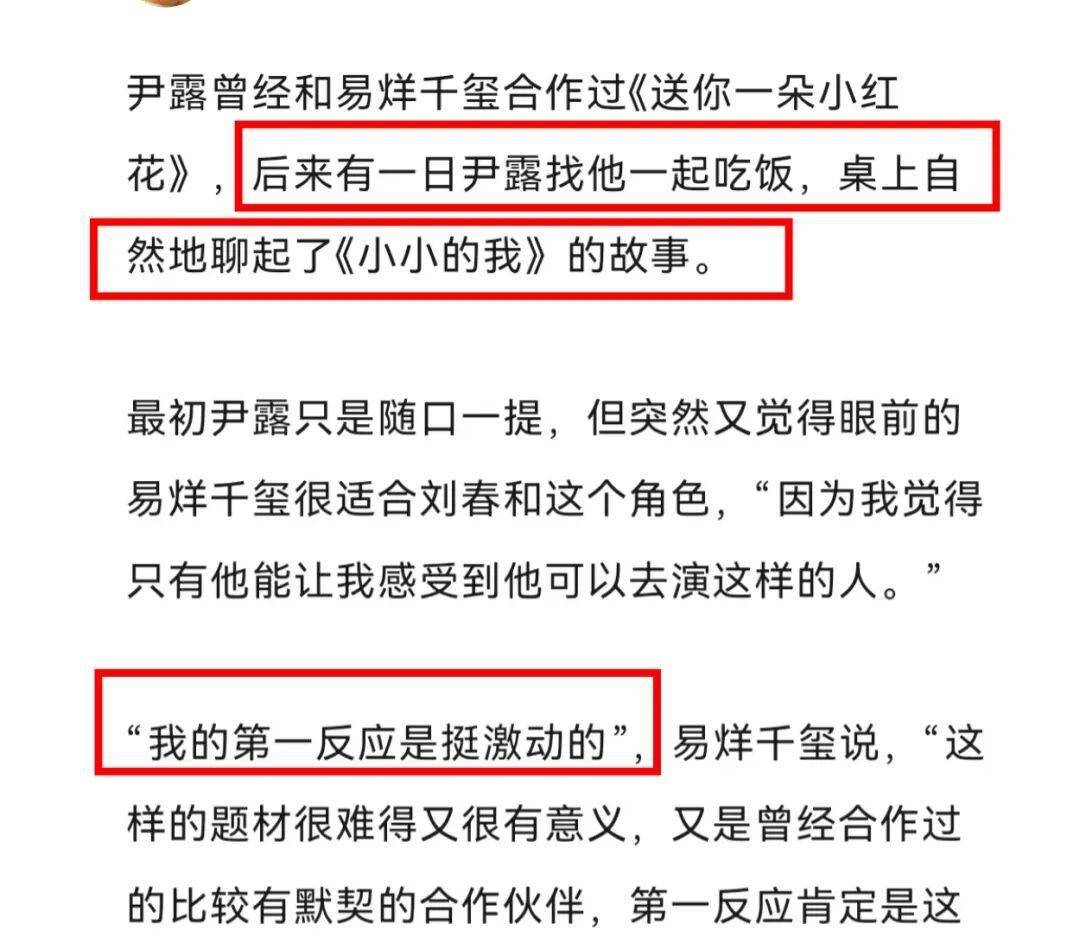 易烊千玺坦言接《小小的我》时“太年轻了,现在肯定不敢接”。这种“勇敢”源于对角色的纯粹热爱。影片投资仅几千万,导演杨荔钠以文艺片见长,风险极高。但易烊千玺被打动后,“打碎自己构建刘春和”,最终用7亿票房和金鸡影帝证明了选择的正确性。