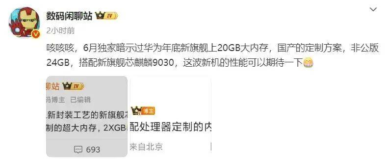 值得一提的是,该博主此前还发文称,6 月独家暗示过华为年底新旗舰上 20GB 大内存,国产的定制方案,非公版 24GB,搭配新旗舰芯麒麟 9030,这波新机的性能可以期待一下。