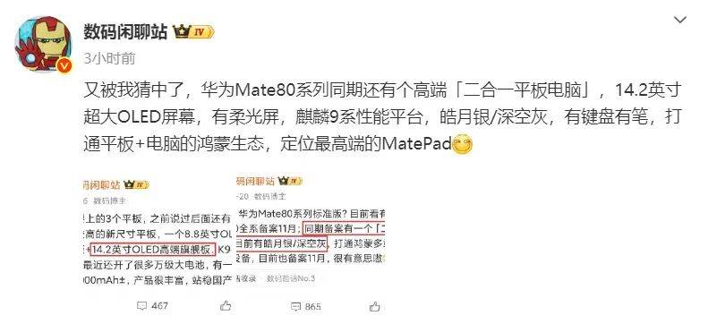 新机方面,今日据博主@数码闲聊站 报道,华为 Mate 80 系列同期还有个高端「二合一平板电脑」,14.2 英寸超大 OLED 屏幕,有柔光屏,麒麟 9 系性能平台,皓月银 / 深空灰,有键盘有笔,打通平板 + 电脑的鸿蒙生态,定位最高端的 MatePad。