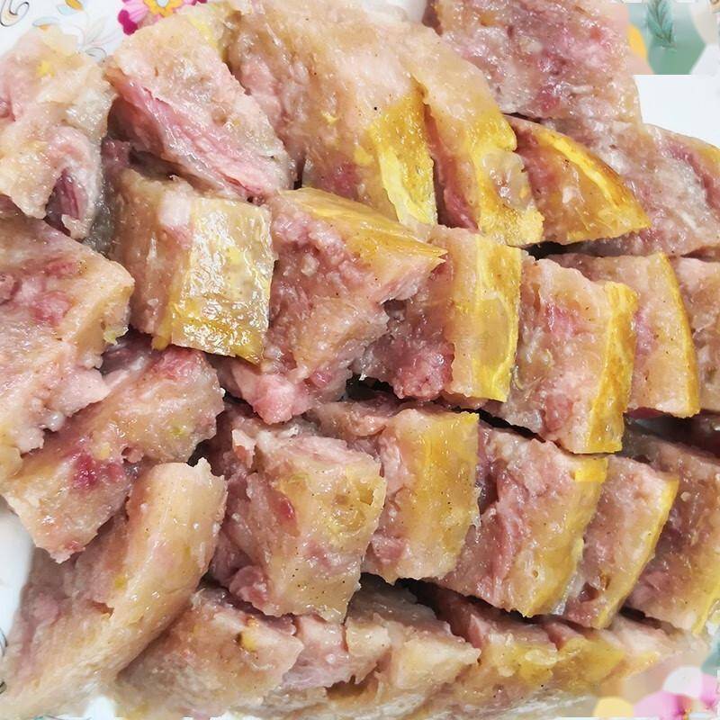 它以精瘦猪肉为主,掺淀粉、植物油和秘制调料,经慢火蒸制数小时,