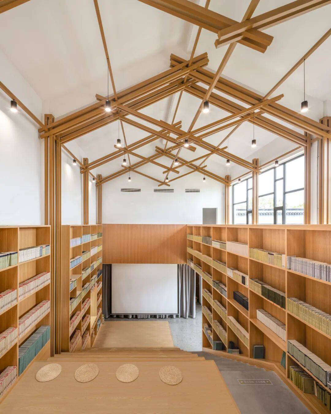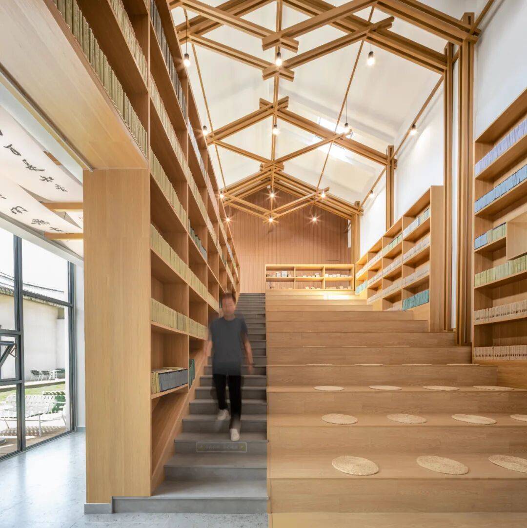 原始建筑定义的讲堂空间被强化氛围营造。首层设置大量开架书柜,延续主空间的木色杆件元素。讲台区域引入灵活开合屏风,调节不同使用场景(集会、讲学、自读)。大台阶既满足功能需求,又通过台阶与书柜的结合增强书香氛围。