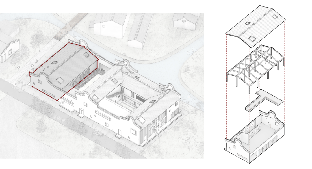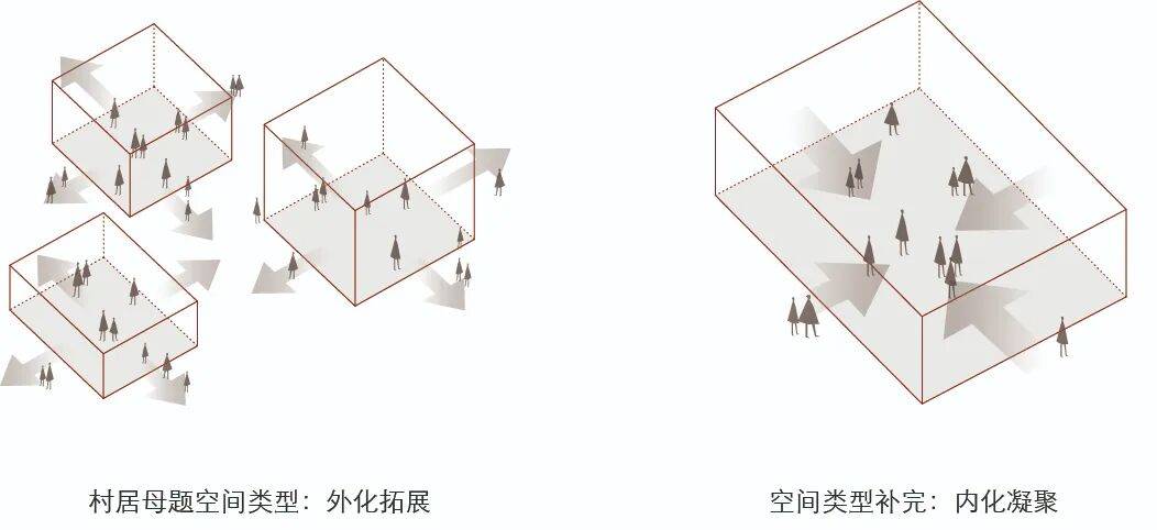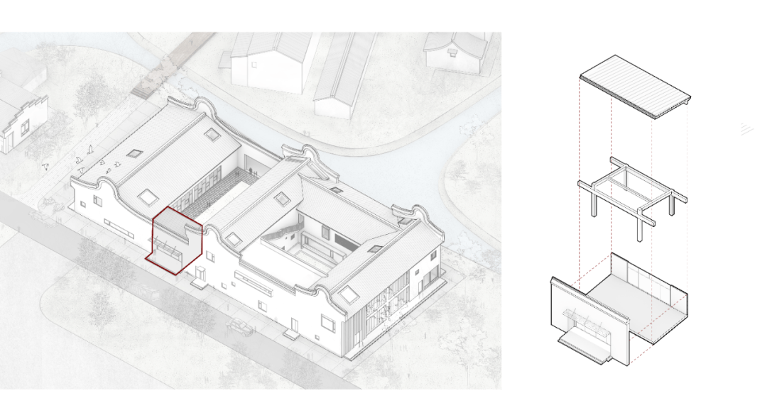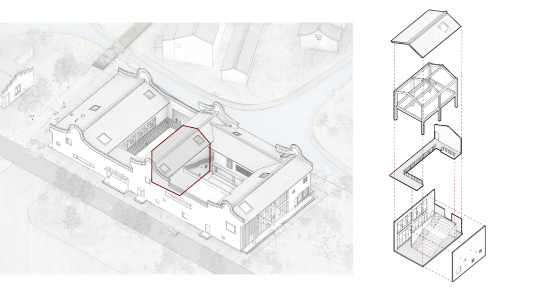 不同于村中其他民居及经营性业态的将空间及人的活动之于建筑本体的“外化”拓展倾向,书院建筑本体则被赋予了以绝对的空间尺度差异将丰富的、散点的乡村生活“内化”凝练、聚焦的机会,亦是某种程度实现对乡村环境进行空间类型补完的契机。