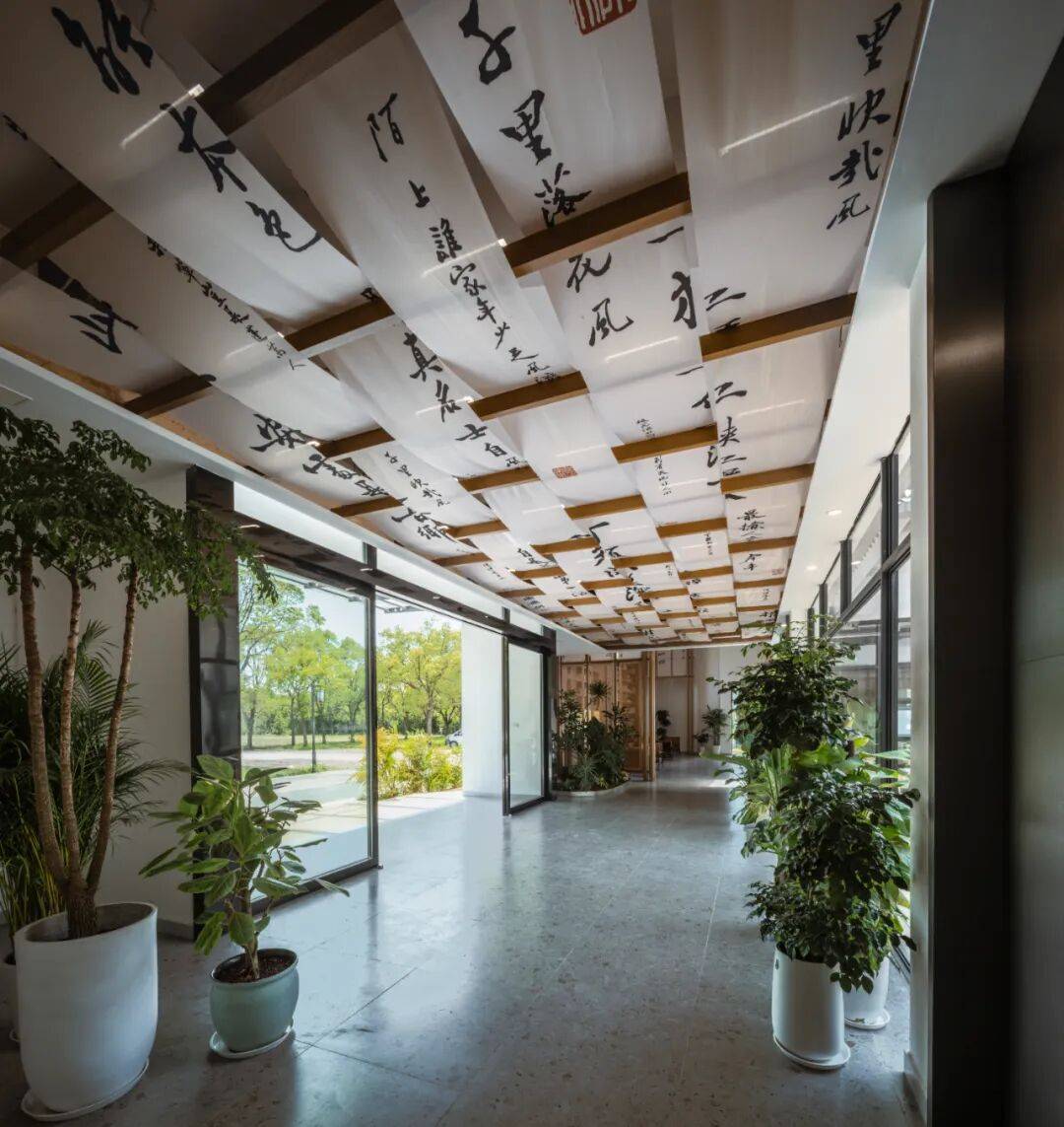 书院主入口门厅直接连接三个主要的趣味空间:进入门厅与书院花园形成对景,门厅向南连接书院主空间,向北连接大台阶空间。设计上希望强调将访客快速导入到核心的趣味空间,形式上“藏晦”,只在天花部分延续统一的重复元素实现空间引导。