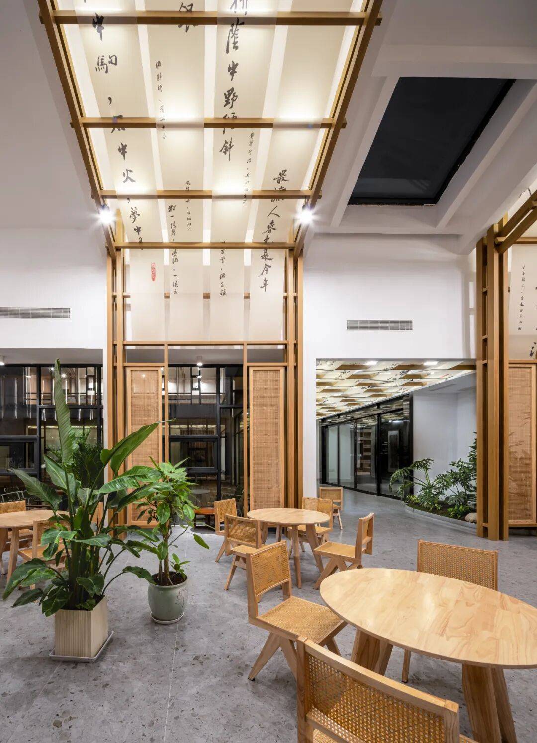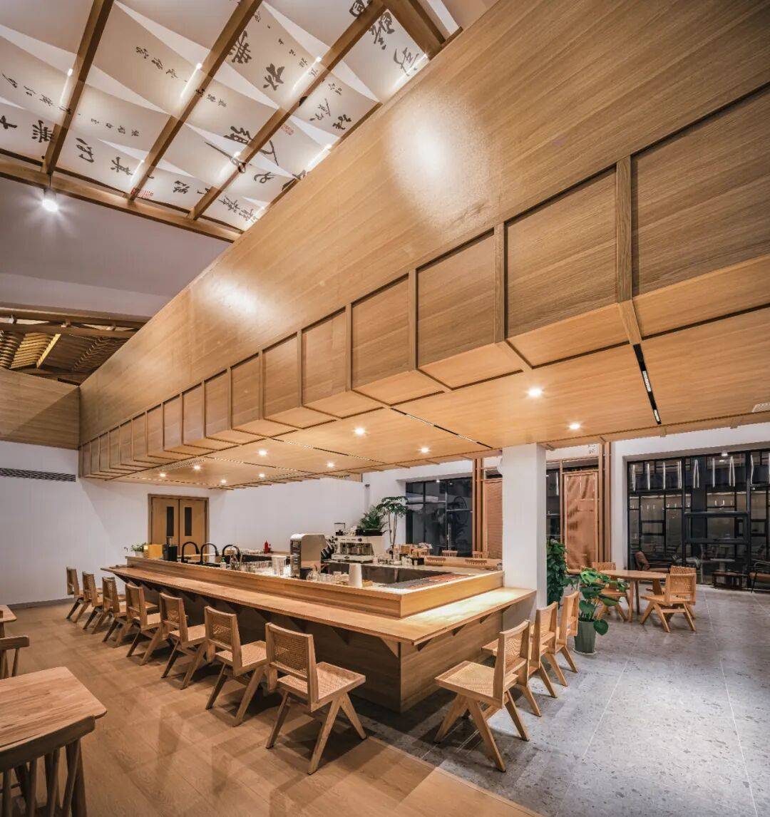 将轻质的、统一的木色杆件元素连续搭接,勾勒出中式传统建筑“”厅、堂“”中的 “柱、椽、檩”等视觉映像。其元素本身不仅是装饰构件,也是空间界定的载体。