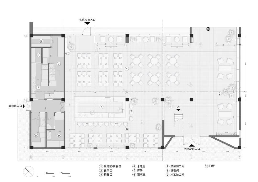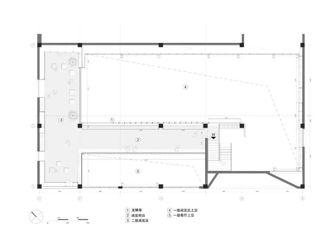 位于“龙鳞卷”下方的书咖吧台区域为书院主空间的经营服务配套,设计权重上让位于两层通高的吹拔空间。同时将原有空间界定模糊、失焦的状况给予稍微清晰的“动、静”界定和层次区分。