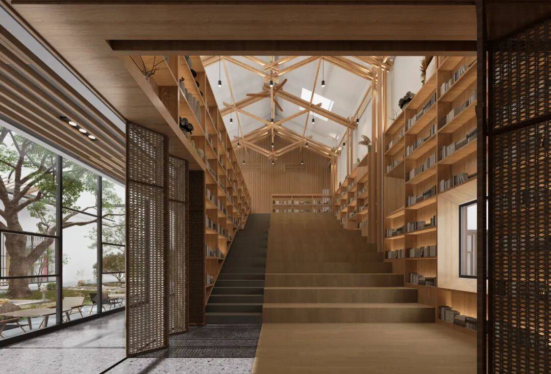 首层台阶区域以大量的开架书柜设计定调书香氛围,通过与主空间呼应的统一杆件构成元素将两层通高吹拔空间统一塑造。原有设计中大台阶的讲台区域与首层平面的公共交通动线重叠存在干扰,设计建议引入满足灵活开合的屏风元素调节不同空间使用场景的需求。
