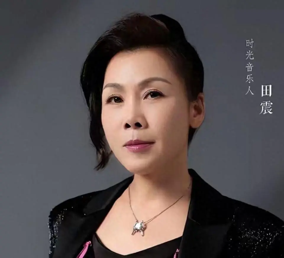 第一张图,这是歌手田震的宣传写真画面:她留着干练的黑色短发,妆容精致,身着带有闪钻装饰的黑色西装外套,搭配简约的内搭与小巧的吊坠项链,造型利落又不失质感。背景是简洁的灰色调,右侧配有 “时光音乐人 田震” 的文字标识,整体风格沉稳大气,契合她成熟歌手的专业形象。