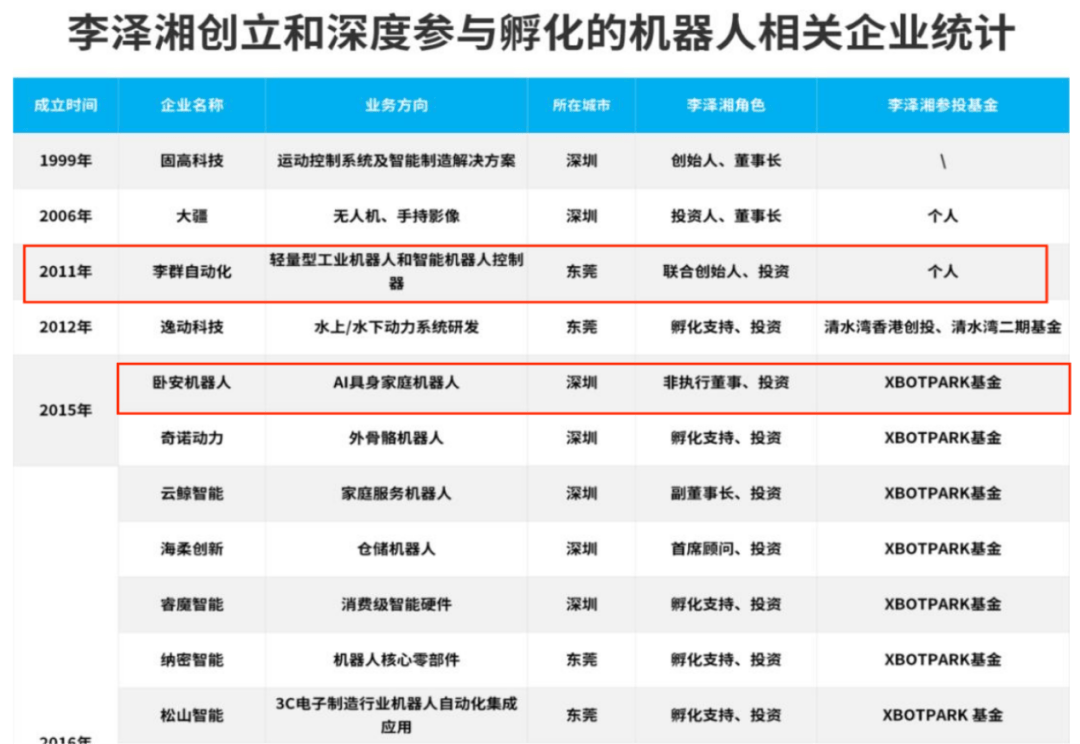 - 卧安机器人:由哈工大2011届校友李志晨、潘阳联合创立。2017年推出全球首款手指机器人SwitchBot Bot,2018年成立卧安机器人。李泽湘于2018年投资500万支持其发展。卧安今年6月向港交所递交IPO申请。
