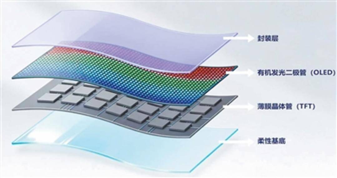柔性屏绝非简单地将传统玻璃屏“掰弯”,要实现这一功能可谓“牵一发而动全身”。它像一个由基底、电子元器件、封装薄膜和盖板等构成的多层“彩虹蛋糕”,当“蛋糕”的每一层都具有柔性后才能实现整体的弯曲和折叠,同时要确保屏幕的显示效果和耐用性。这就需要柔性基底材料、核心电子元器件、结构设计和柔性封装技术等多个领域的协同创新。