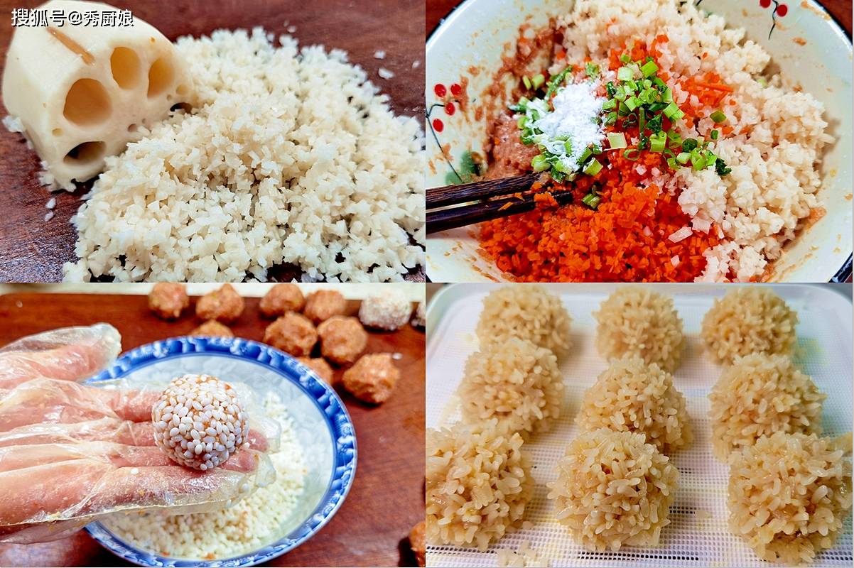 食材:糯米半碗(提前浸泡2小时)、猪肉馅200克、莲藕1小节、胡萝卜半根、淀粉2勺、生抽、盐、葱花。