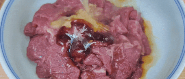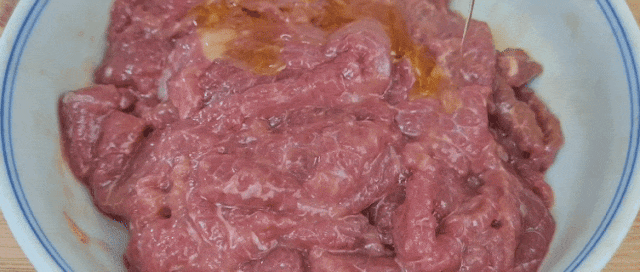切记腌牛肉时,千万不要加料酒和盐,用盐和料酒腌制出来的牛肉又干又柴,还塞牙。