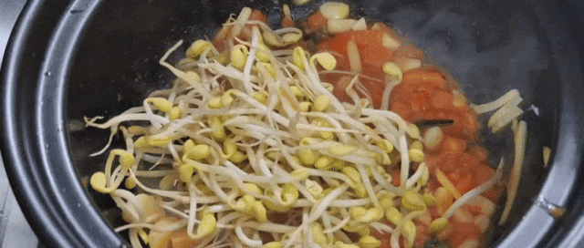 把是西红柿丁放进来,跟着加一点盐把番茄炒出蓉,再把豆芽放进来翻炒一下。