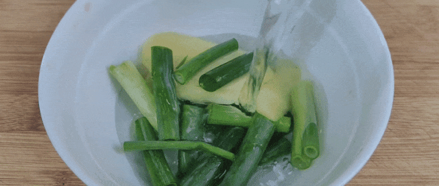 再准备点小葱切段,几片姜片装入碗中,加少许清水,下手给它抓出葱姜水。