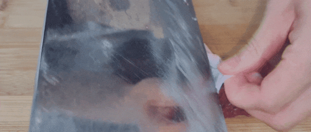 注意看,牛肉的纹路是竖着的,就要顶刀把它的纹路切断,俗话说的好“横切牛肉竖切羊”。然后再切成一枚硬币厚度的片就可以了。