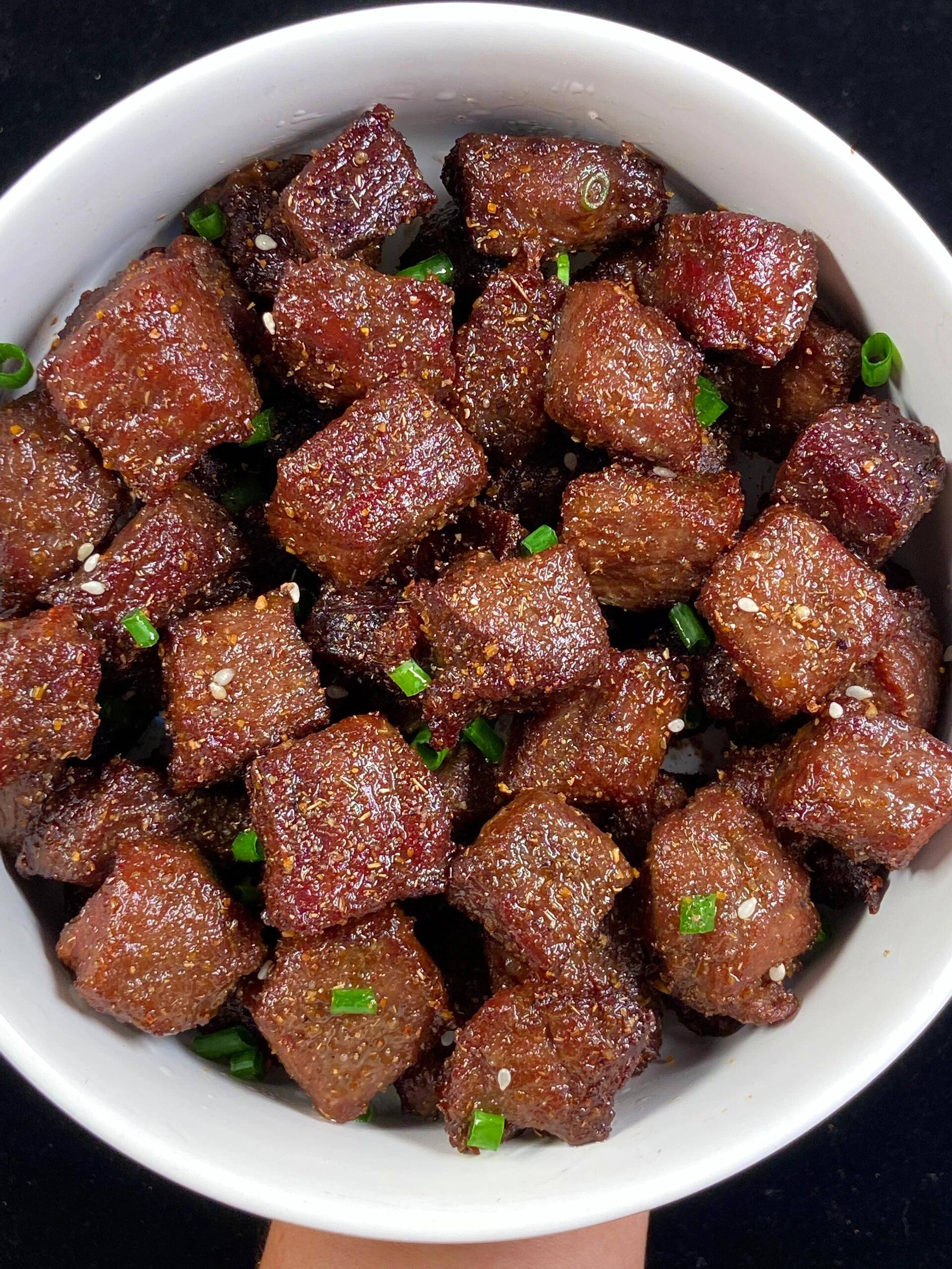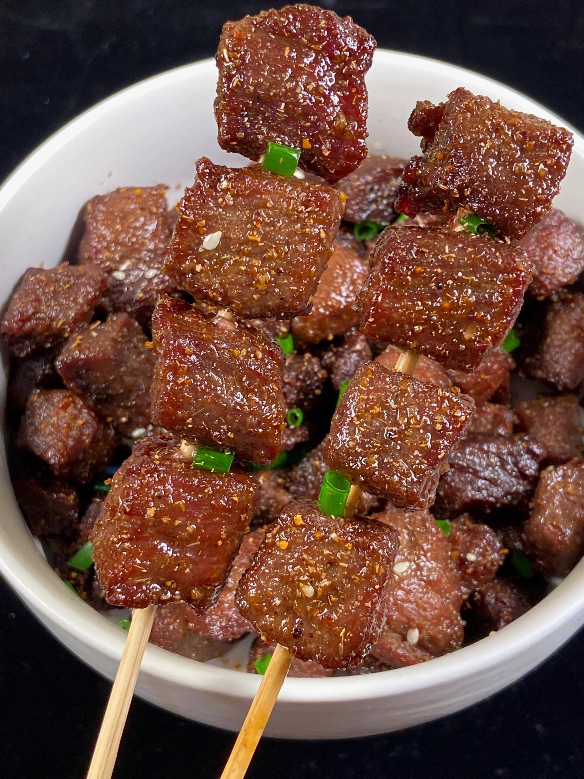记忆里,第一次做这道菜时,我因火候把控不当,肉粒焦硬如石。后来才悟到,炒牛肉需“快狠准”,油热下锅,变色即起,方能留住柔嫩。如今每次翻炒,铁铲与锅碰撞的声响,都让我想起大学夜市摊上,维吾尔族大叔挥舞长勺的利落身影。他总在撒孜然时哼唱维吾尔民歌,火光映着他卷曲的胡须,肉香与歌声一同飘散在深夜的街巷。孜然牛肉粒,是丝路饮食交融的缩影。唐代驼队穿越戈壁,将孜然带入长安,中原的烹饪技法与中亚香料碰撞,诞生了这道“中西合璧”的滋味。牛肉的醇厚与孜然的狂野,恰似文化交流的隐喻——不同风味在碰撞中相融,淬炼出新的生命力。如今,这道菜早已扎根于市井餐桌,烧烤摊、家常锅,处处可见它的身影,成为烟火人间最生动的注脚。