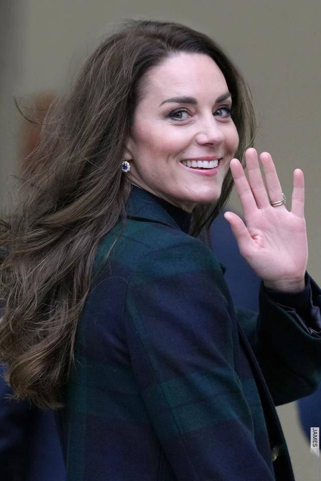 状态加持:卷发造型巧妙修饰了凯特术后略显消瘦的面颊,配合灿烂笑容与明亮眼神,展现饱满健康状态。