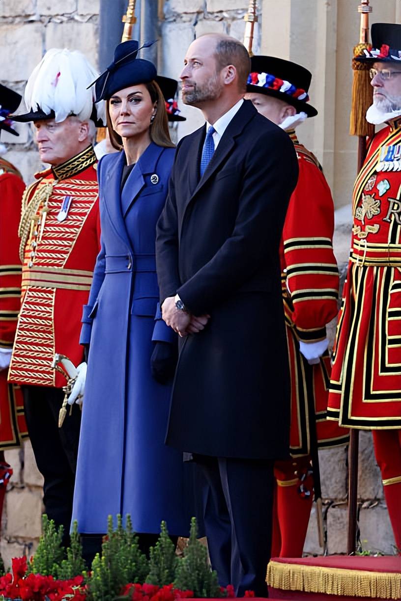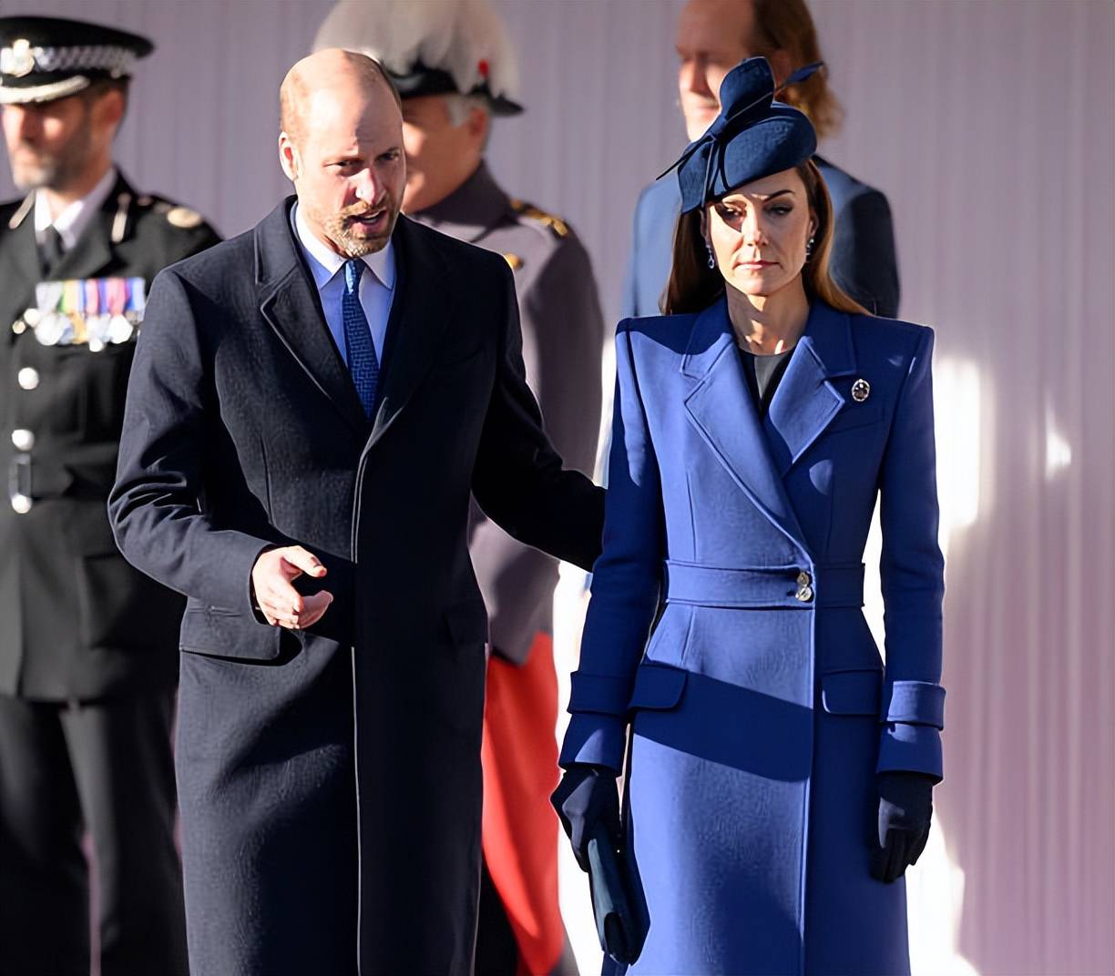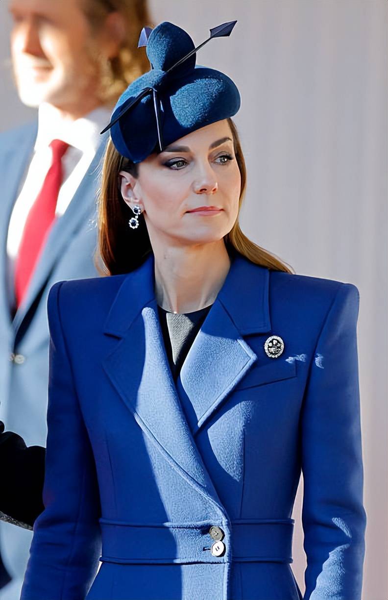 她穿了一身全蓝色的造型,那件亚历山大·麦昆的宝石蓝大衣,眼尖的人立刻认出来,这和她2023年圣诞礼拜穿的是同一件。 但这次,她在领口别上了一枚威尔士亲王羽毛胸针,瞬间给温柔的造型注入了正式的外交气场。