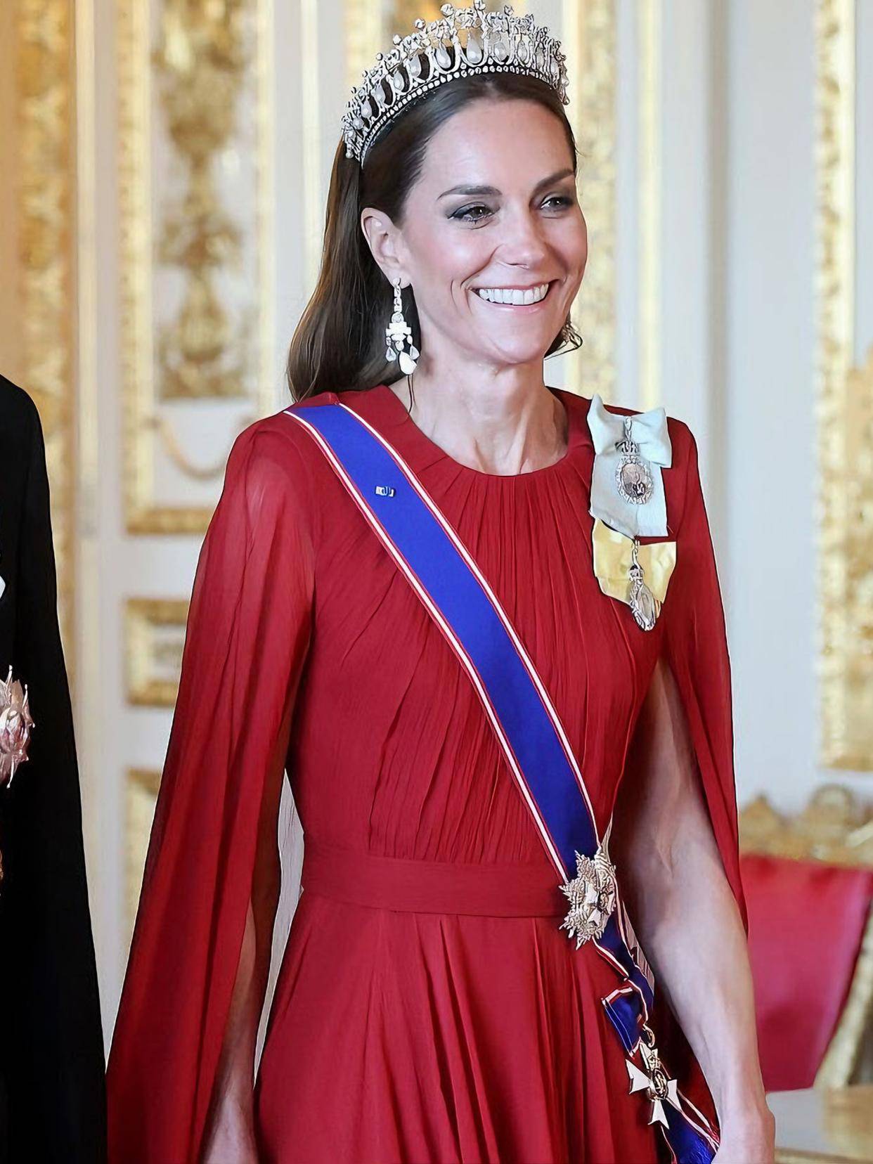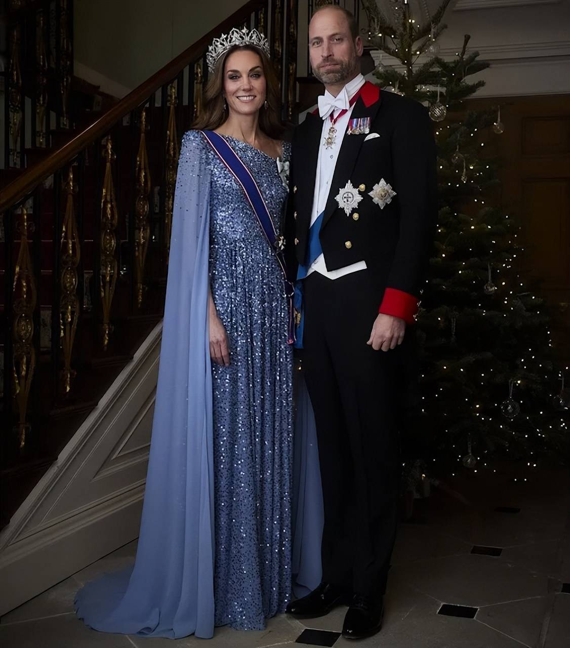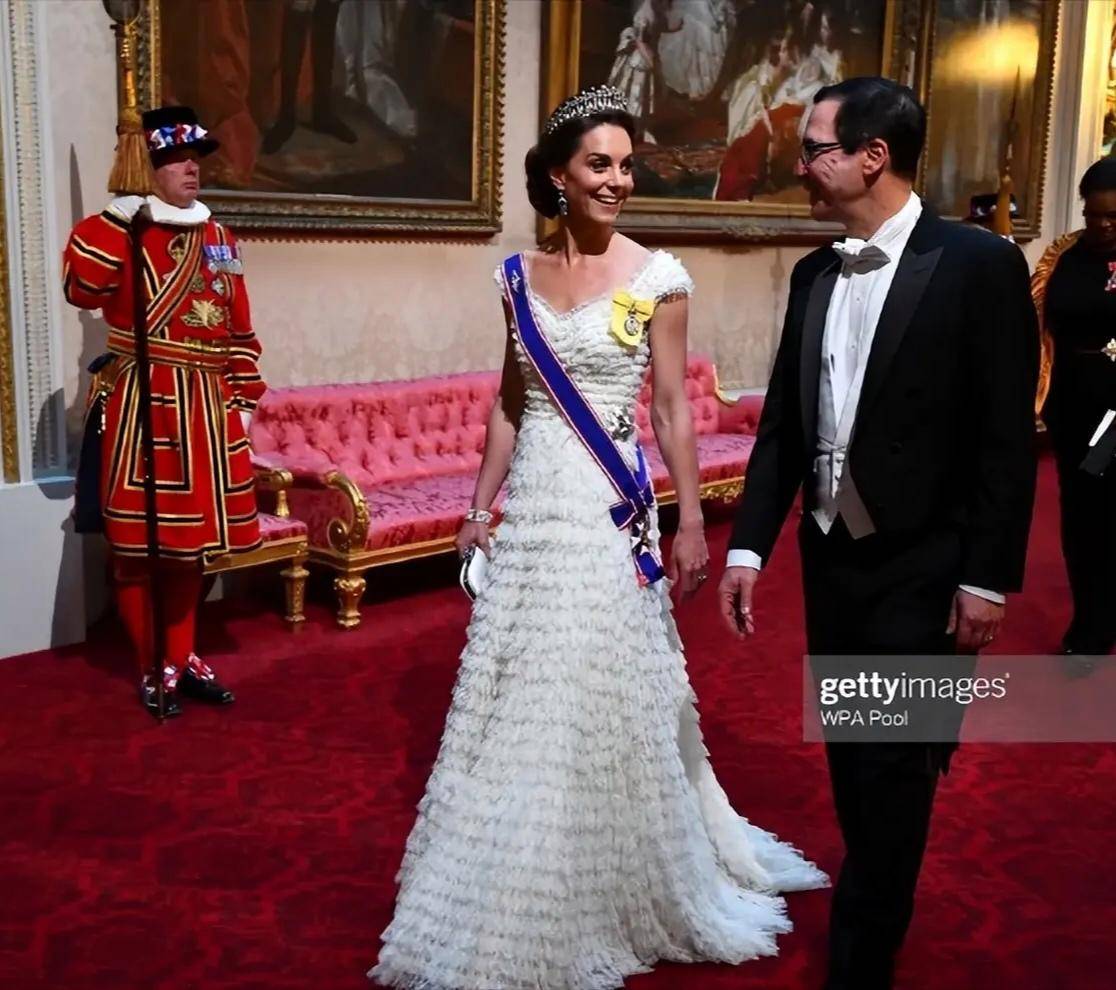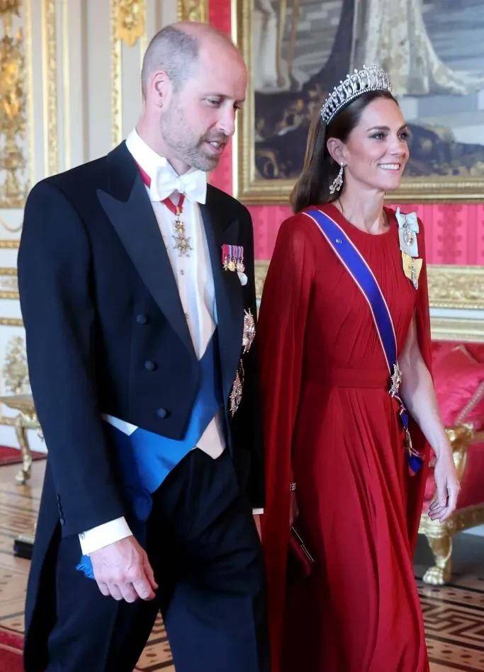 她还佩戴了象征王室身份的皇家维多利亚勋章绶带和星章,完成了从王妃到未来王后的形象升华。 整个造型在温莎城堡的宴会厅里,散发着不容忽视的华贵光芒。