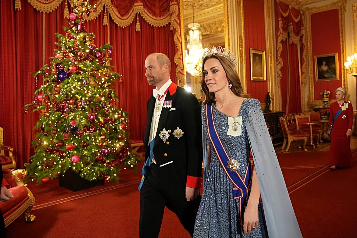 - 发型突破:不同于国宴常见的盘发造型,凯特选择了散落的大波浪卷发。这一减龄发型搭配皇冠,赋予她灵动的少女感,被形容为"仿佛童话故事中走出来的一样"。此前因癌症治疗导致体重下降而被吐槽"过分瘦"的凯特,此次状态饱满,展现出"满血复活"的良好气色。