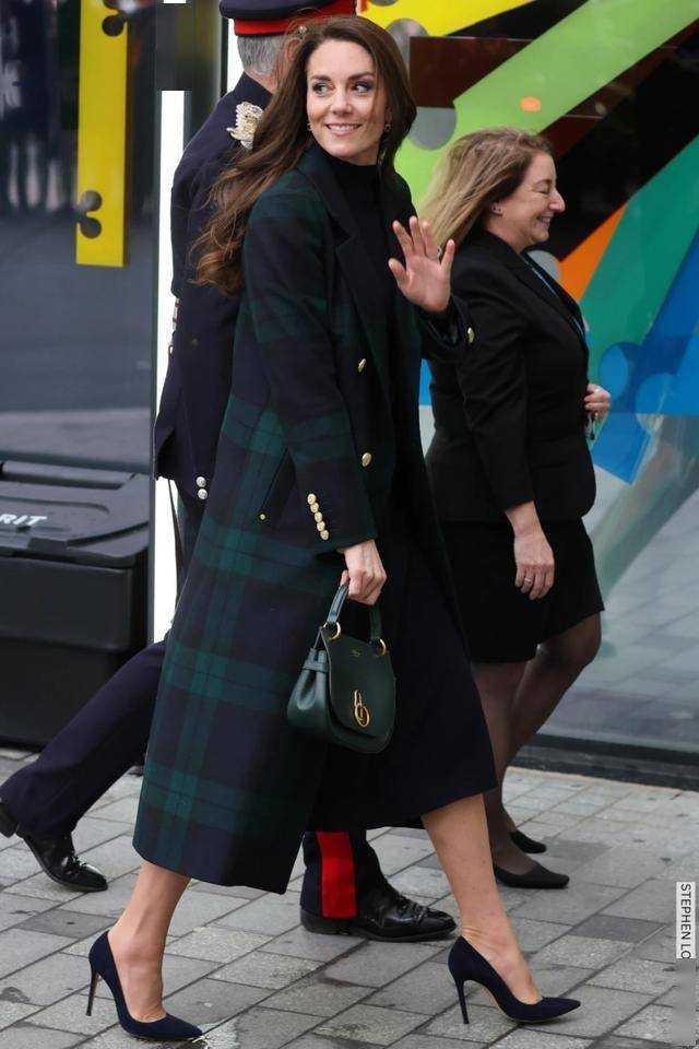 2023 年的首个公开活动中,凯特以一件荷兰库珀(Holland Cooper)的蓝绿 “黑卫士” 格纹大衣开启了新一年: