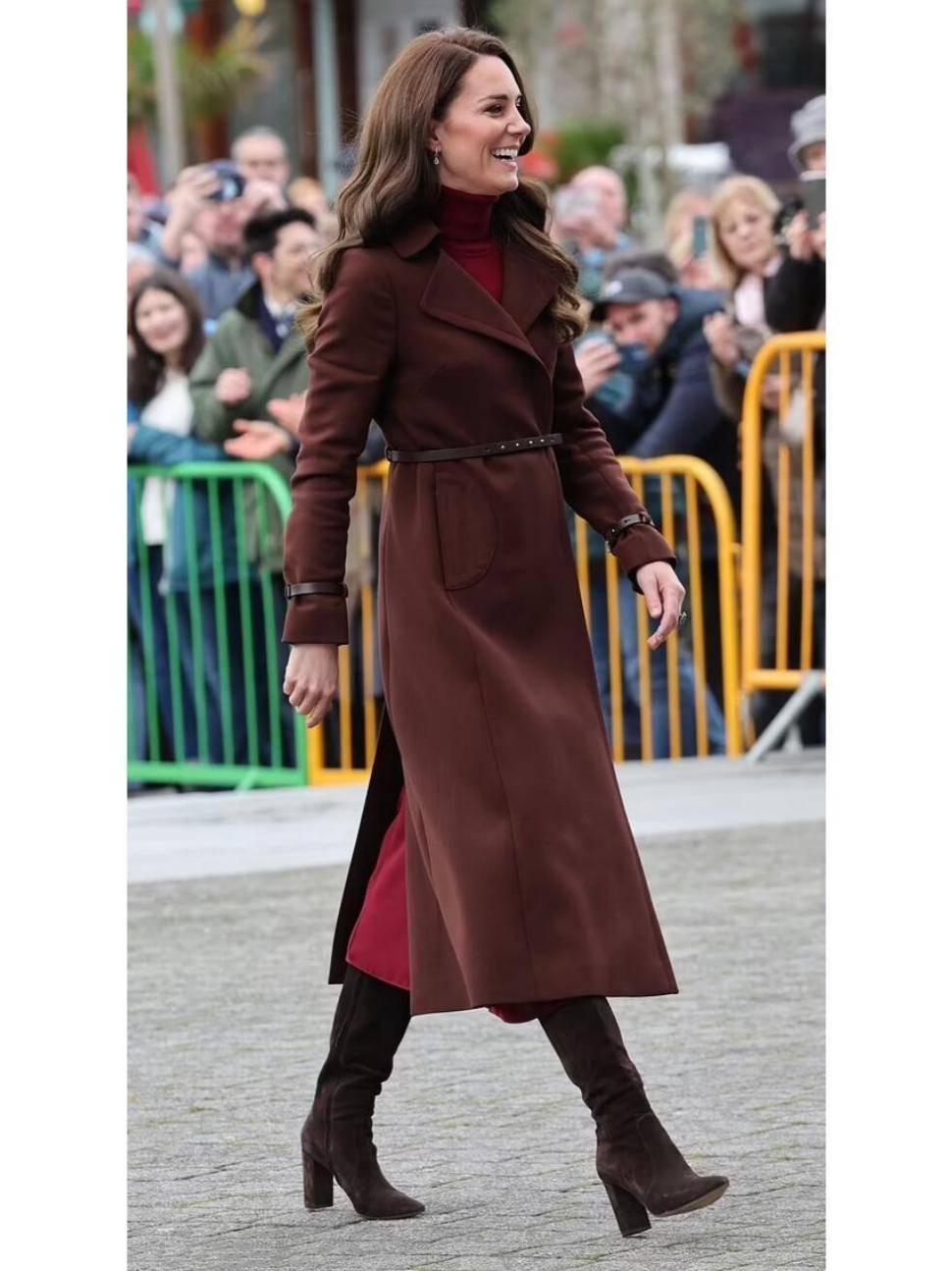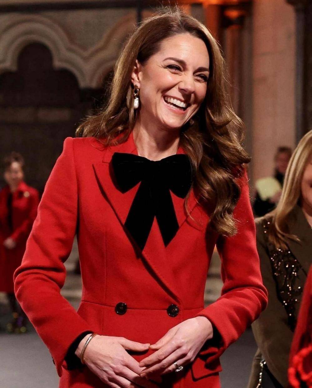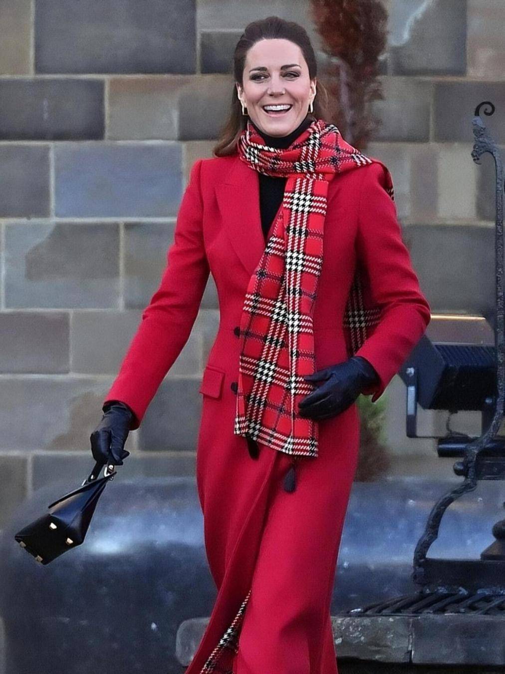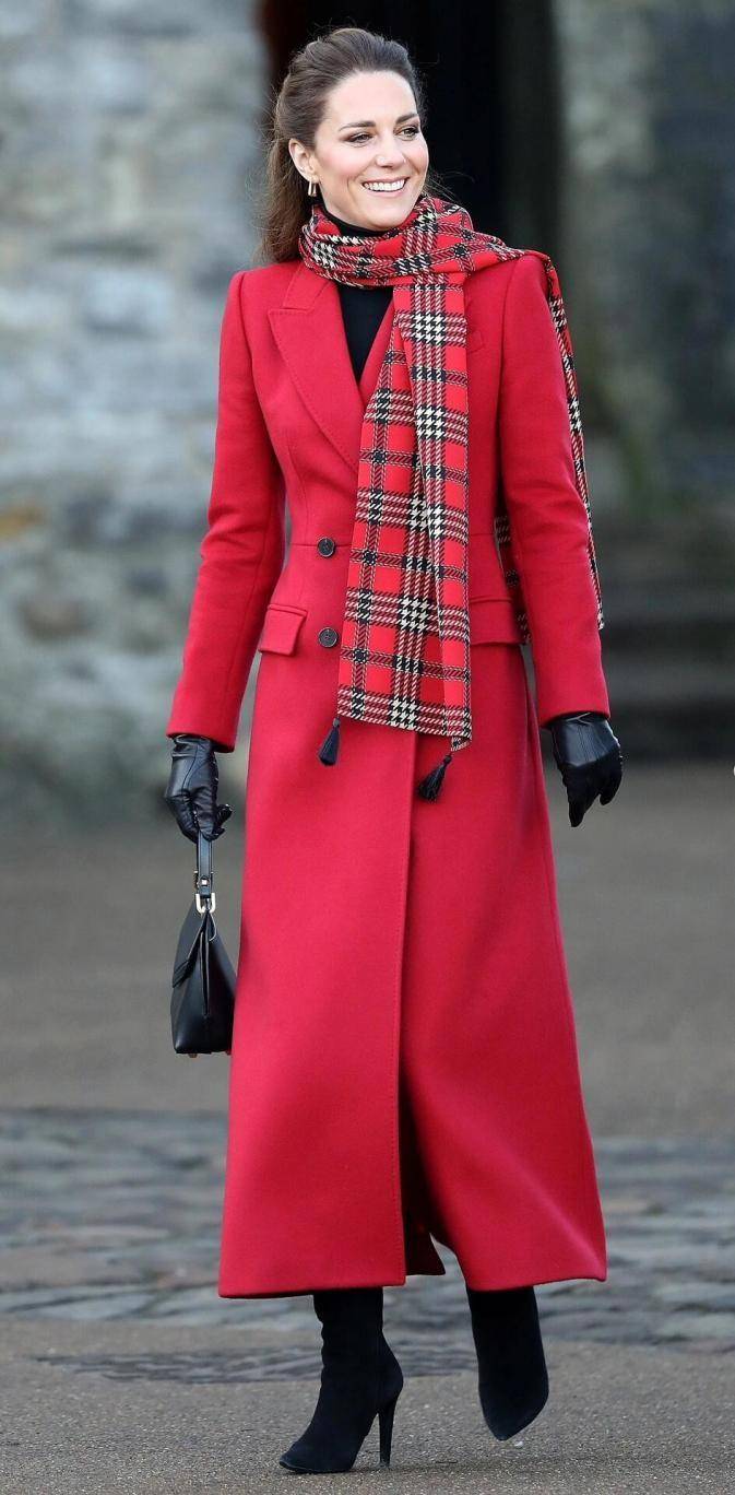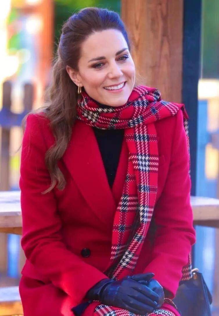 针对于红大衣的穿搭而言,主要是涉及到了三身。我们先来瞧一瞧第一套造型,身上所穿的这件大红色大衣,其衣摆的长度已然逼近脚踝,如此一来便缩小了适穿的人群。凯特王妃的官方身高为 175cm,穿上这种长款大衣不用担心会压个子,当腰板挺直走路的时候反而极具气场。由于天气寒冷的缘由,脖子上戴着一条围巾,其颜色是以红色作为主要色调,与大衣一同出现的时候显得格外喜庆。