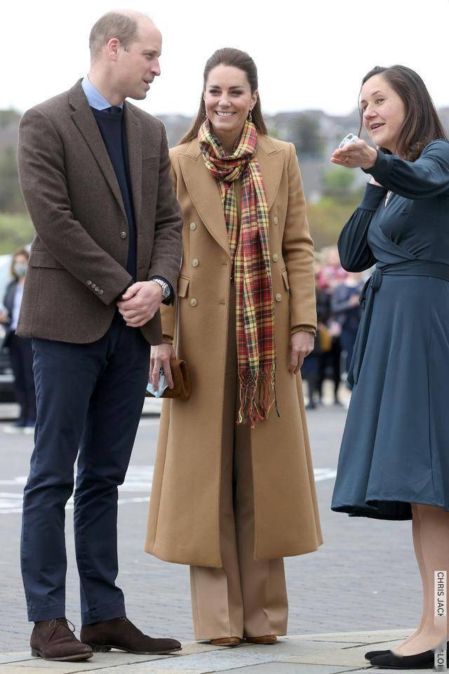 2021 年造访奥克尼群岛时,凯特身着 massimo dutti 的驼色大衣,内搭坦波丽伦敦(Temperley London)的金色针织衫,让斯特拉森格子真丝围巾成为全场焦点。