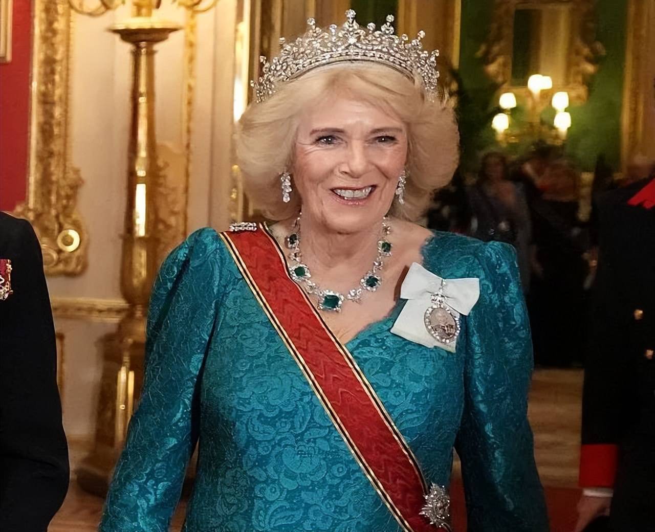 卡米拉王后同样以隆重造型出席国宴,身着一身蕾丝绿裙,搭配耀眼的蓝宝石项链。她佩戴的皇冠虽不及凯特的新皇冠罕见,但依然彰显了王室成员的身份与地位。绿色礼裙在灯光下呈现出独特的珠光变色效果,近看为翠绿色,远观则呈蓝色,工艺精湛。