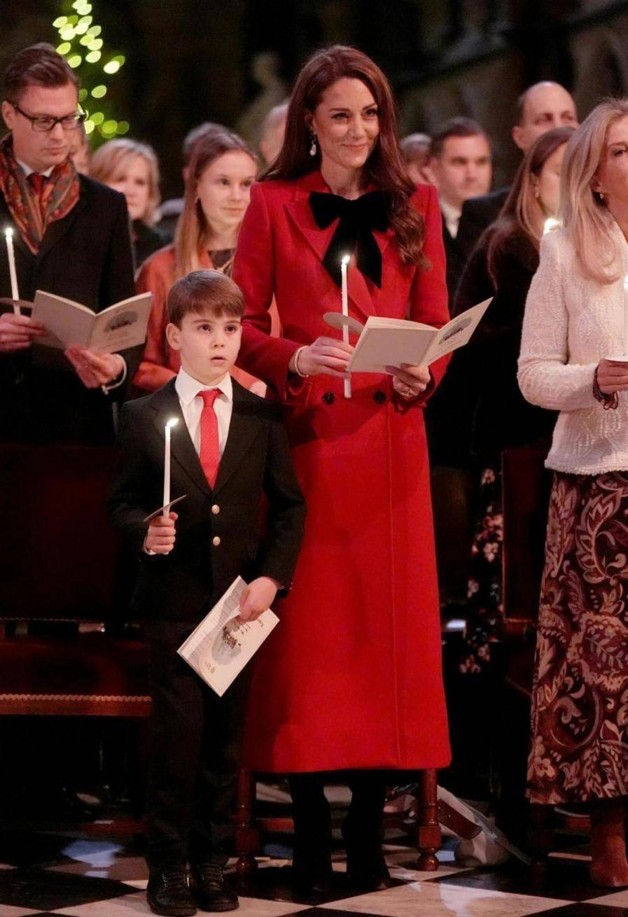 那次,凯特以类似方式搭配这条抢眼的红色半裙,配上布若拉(Brora)的简约黑色针织衫和同款尖头靴。玛平 & 韦伯(Mappin & Webb)的钻石耳环则为整体增添了圣诞氛围的闪耀感。