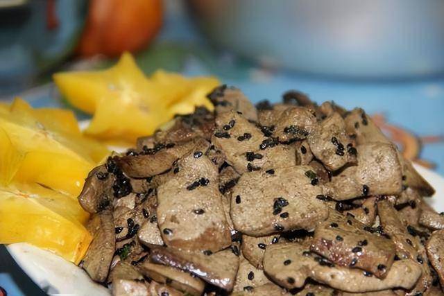 2、锅内放水,大火烧开,将洗干净的猪肝放进去稍煮片刻,捞出放凉,切片;