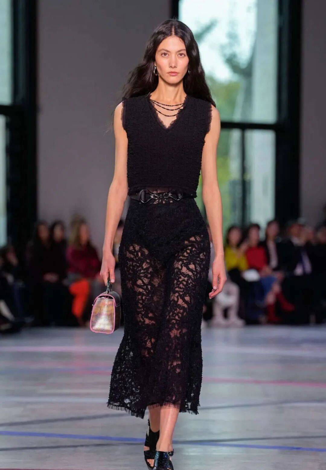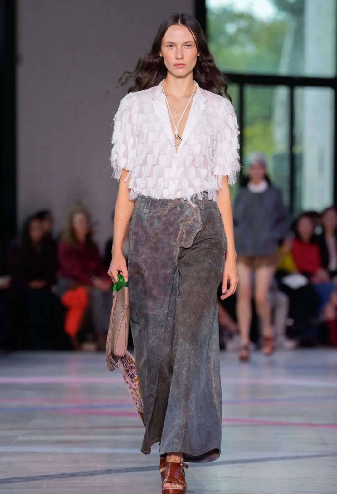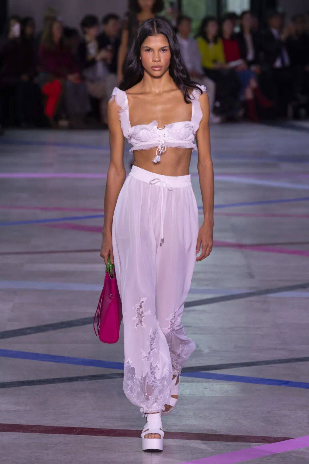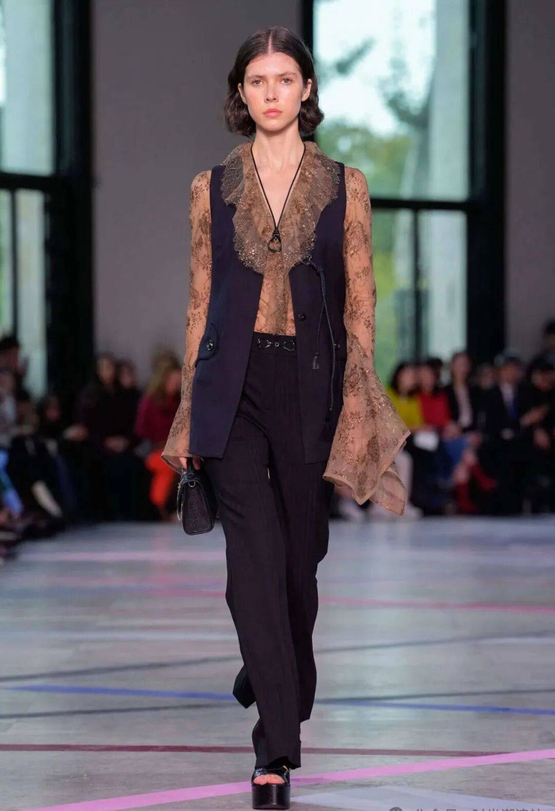大喇叭裤搭配背心,蕾丝上衣搭配软料下身。
