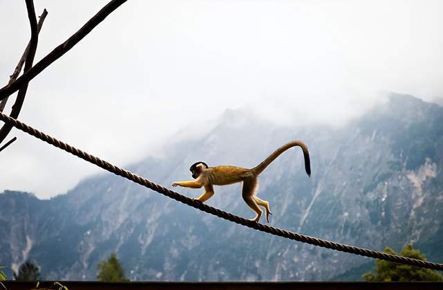 猴子的平衡能力丝毫不逊于山羊,且树栖生活对其平衡提出了更高要求。尽管猴子重心不如山羊稳定,且缺乏同等发达的前庭系统,但它们拥有一项“秘密武器”——尾巴。许多猴子(如卷尾猴、松鼠猴)的尾巴可作为第五肢使用,既能辅助平衡,又能缠绕树枝或物体提供额外支撑。这种主动调节平衡的能力,在复杂三维空间中尤为有效。