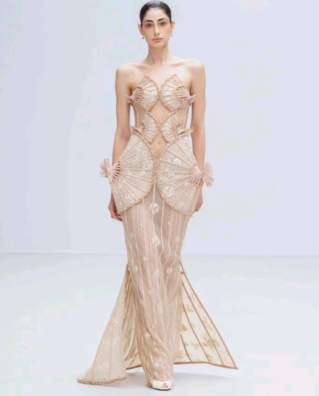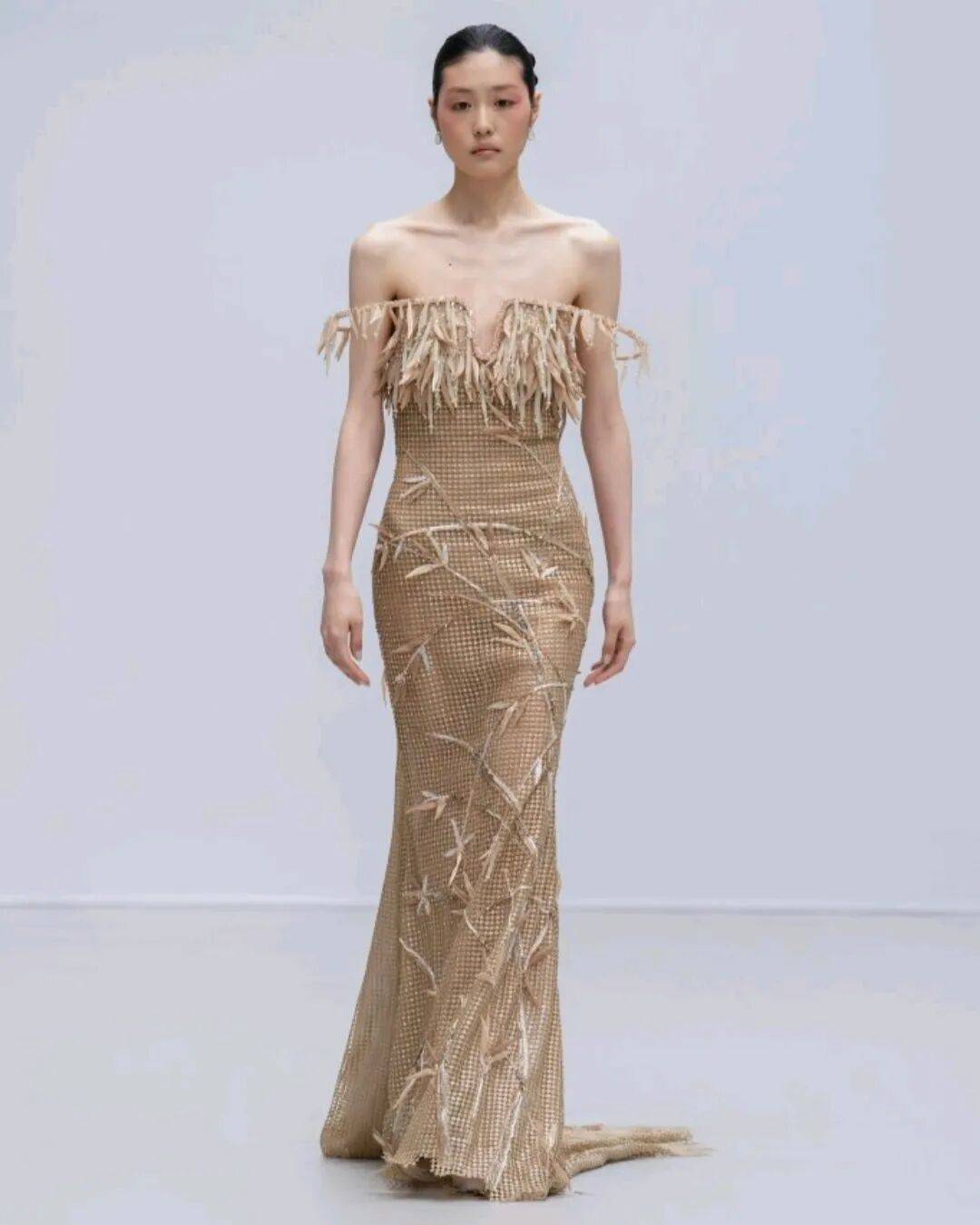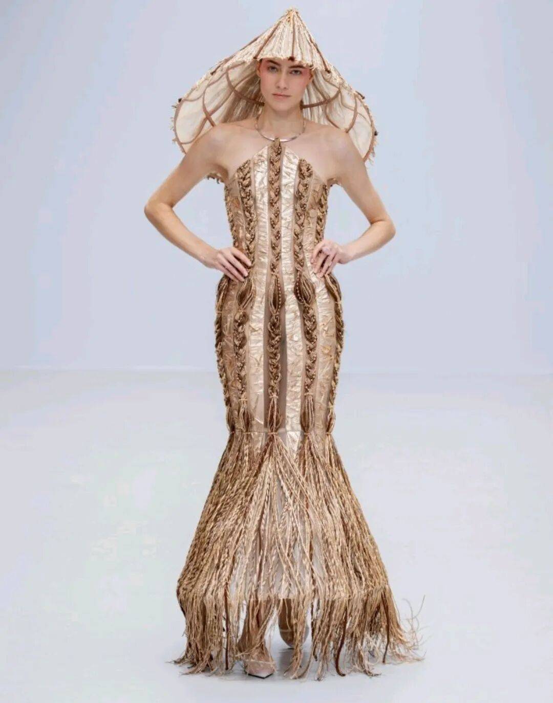 竹编工艺革新:将越南传统竹编技艺解构为镂空胸衣或肩部框架,与水晶镶嵌的帽饰结合,形成“劳动者精神”与“高定工匠美学”的对话。