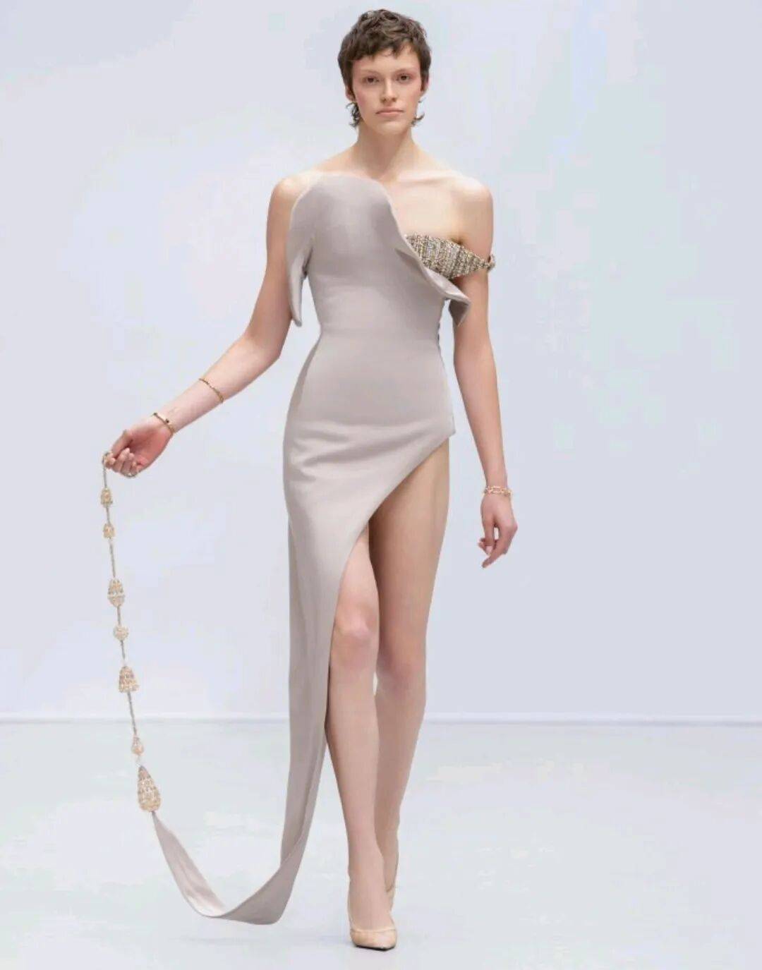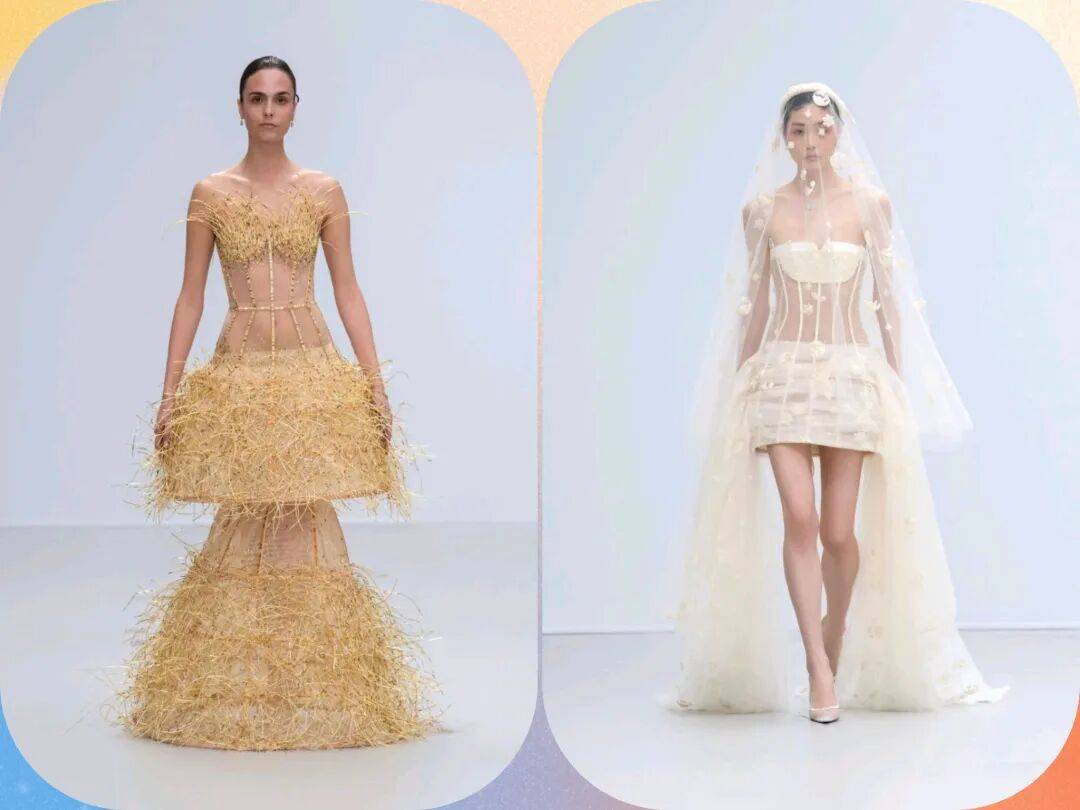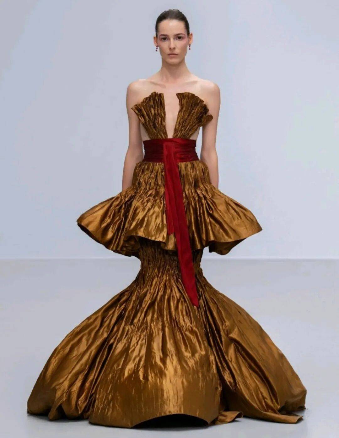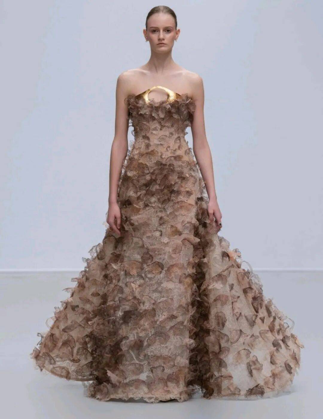竹编工艺革新:将越南传统竹编技艺解构为镂空胸衣或肩部框架,与水晶镶嵌的帽饰结合,形成“劳动者精神”与“高定工匠美学”的对话。