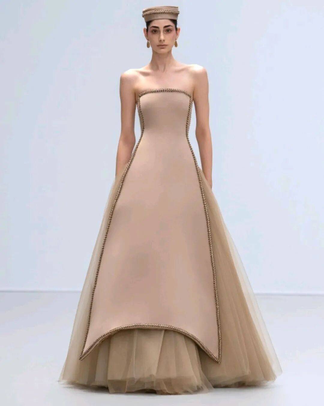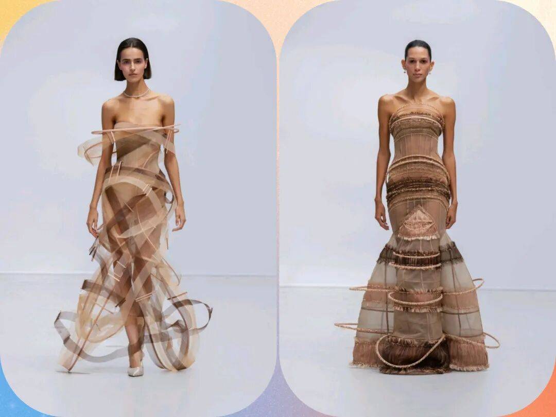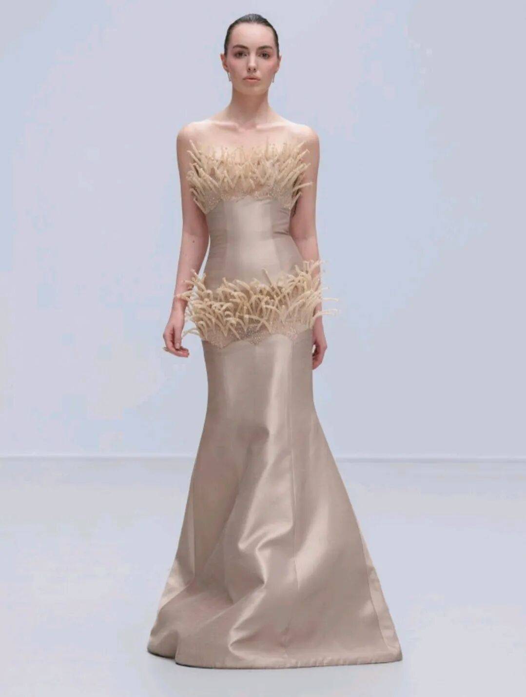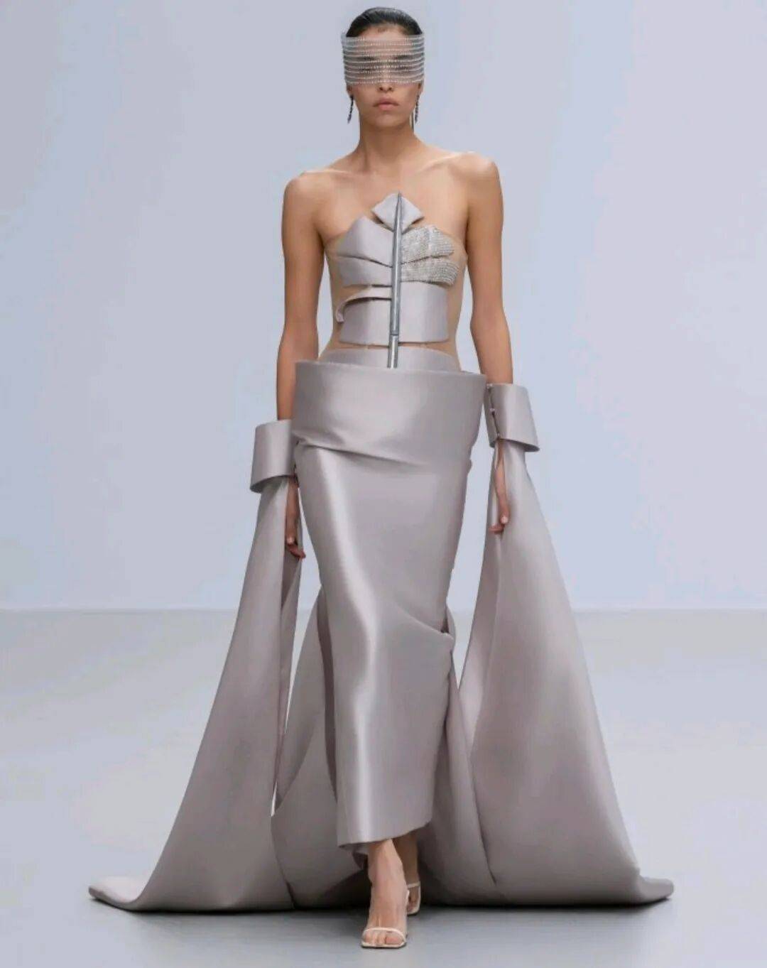 竹编工艺革新:将越南传统竹编技艺解构为镂空胸衣或肩部框架,与水晶镶嵌的帽饰结合,形成“劳动者精神”与“高定工匠美学”的对话。