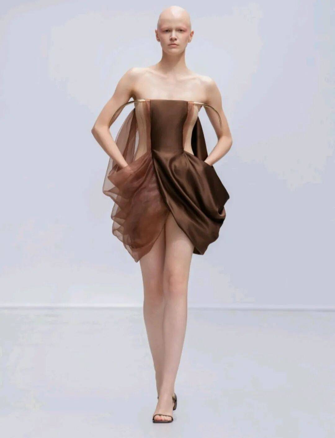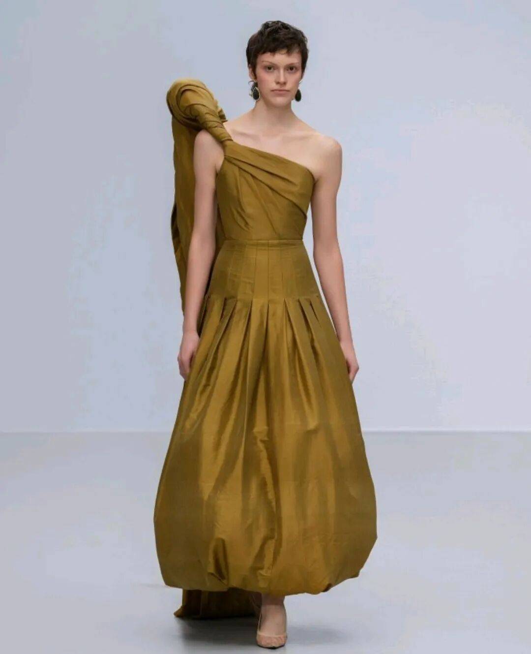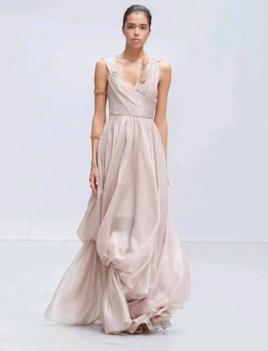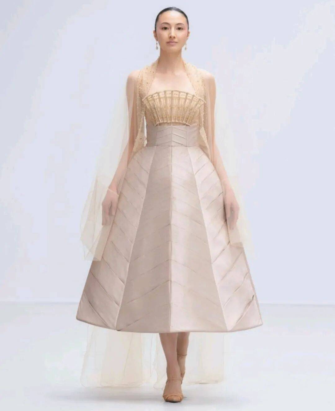立体造型胸衣搭配宽松A型裙摆,灵感源自越南农妇斗笠垂坠线条,在柔美廓形中注入力量感。