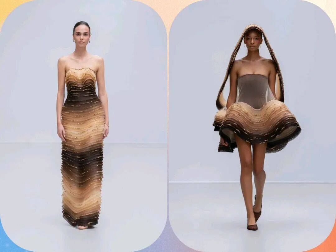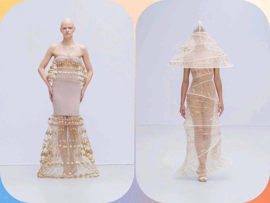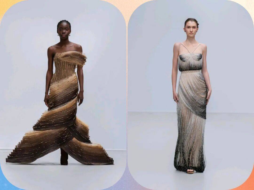 将藻井纹样、飞天飘带等经典符号转化为立体廓形线条,例如裙摆通过3D褶皱模拟壁画中的流动曲线,赋予服装建筑般的空间张力。