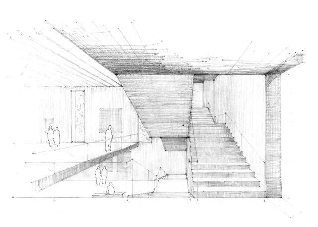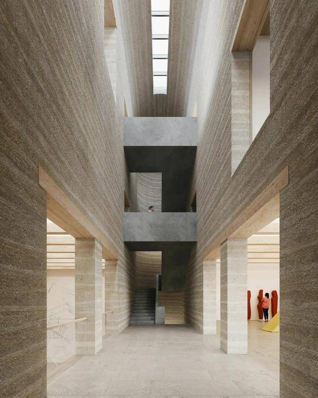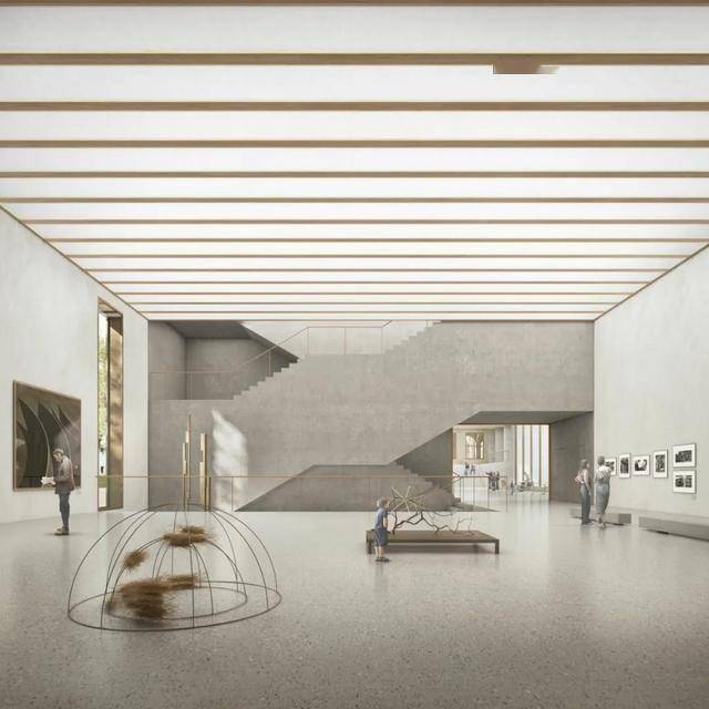 设计理念:该方案在尊重历史建筑的同时追求现代独立性。通过立面的雕塑感、水平线条与材料选择,新建筑既与旧馆形成对话,又以一条“狭窄缝隙”明确区分两者,展现出稳重而富有张力的气质。