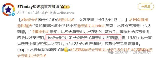 到了2021年7月,台媒报道说阮经天已分手8个月,原因是祖儿团队不赞成两人交往。