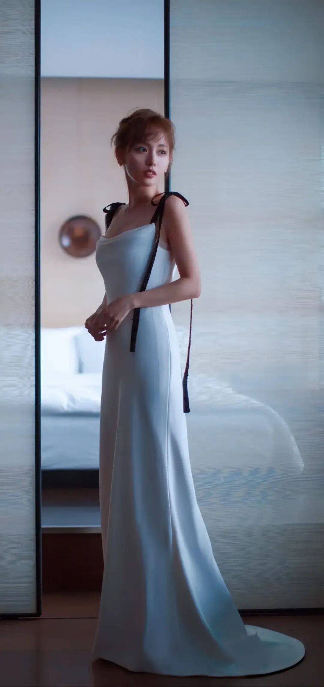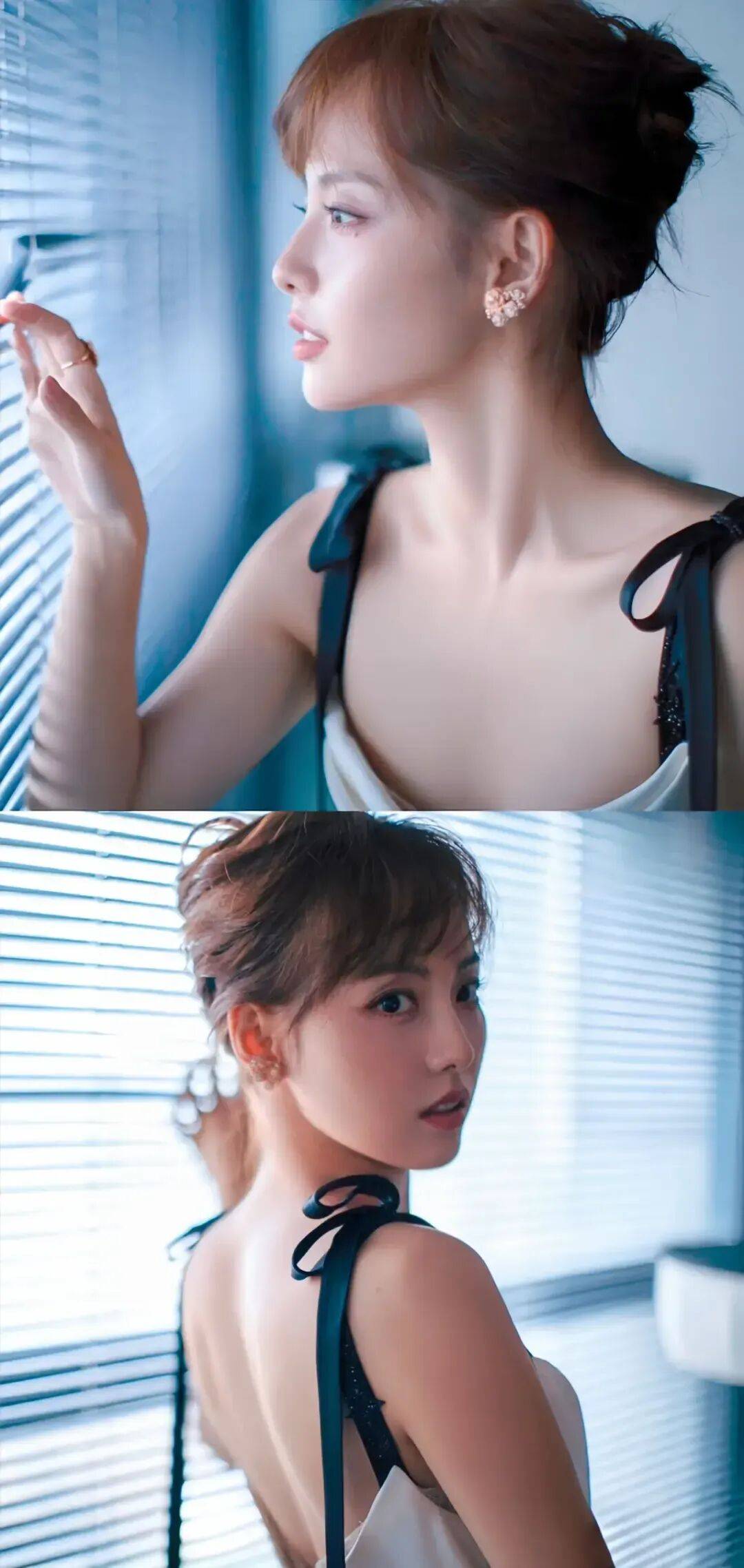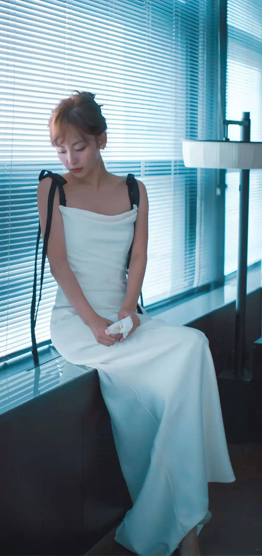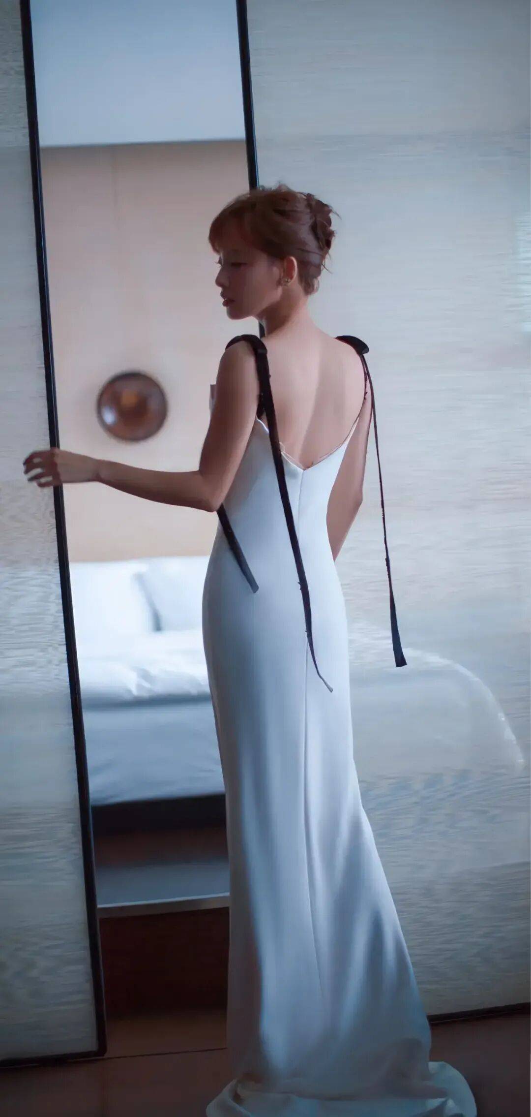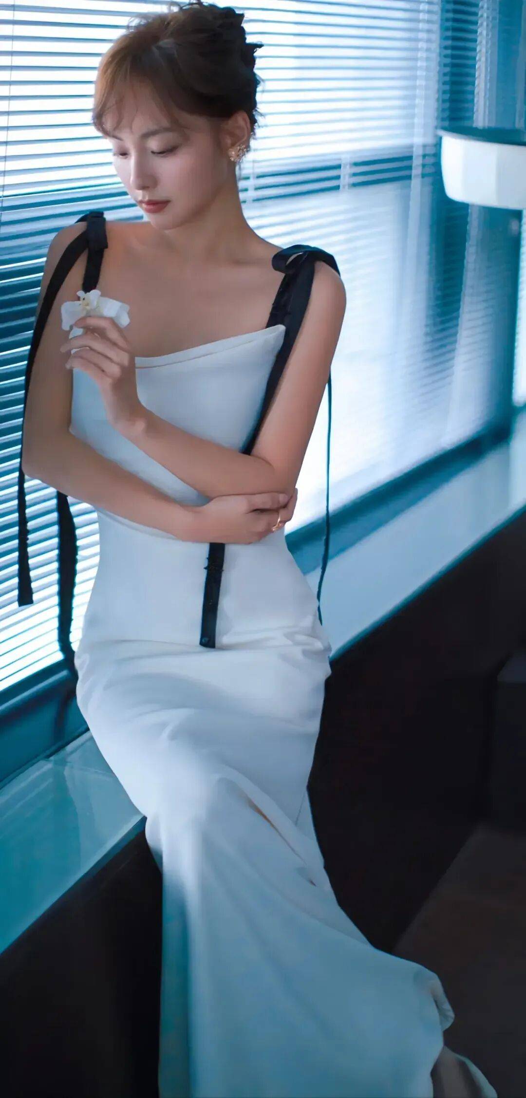 张嘉倪|吊带露背收腰小白裙,漂亮极了!