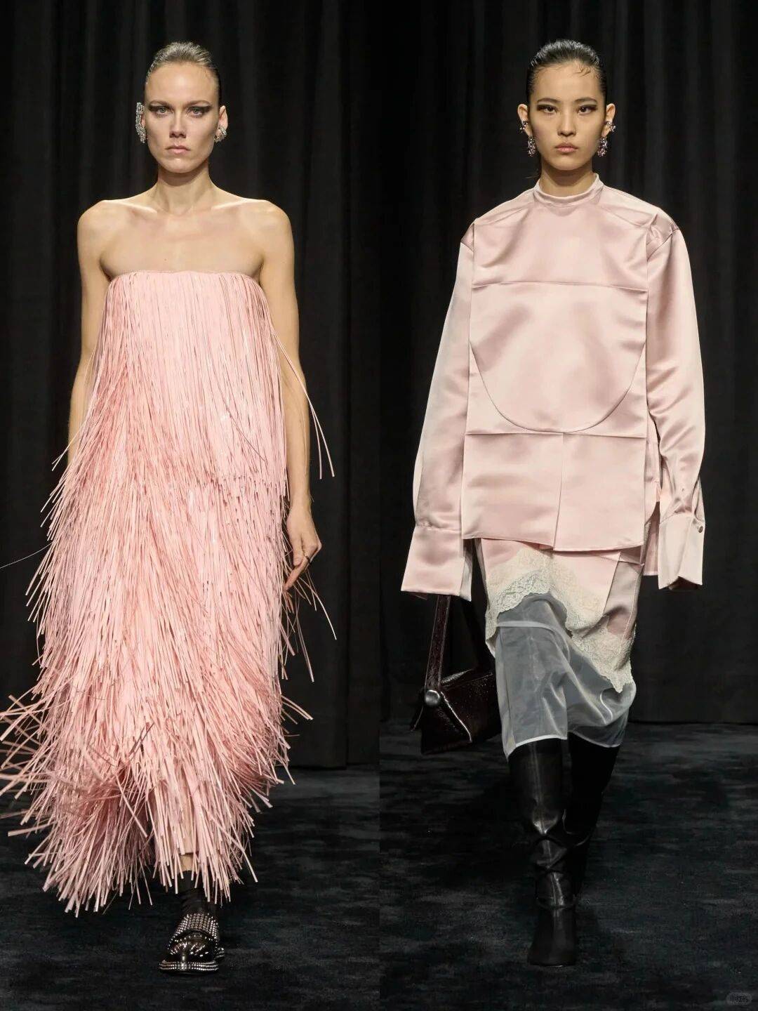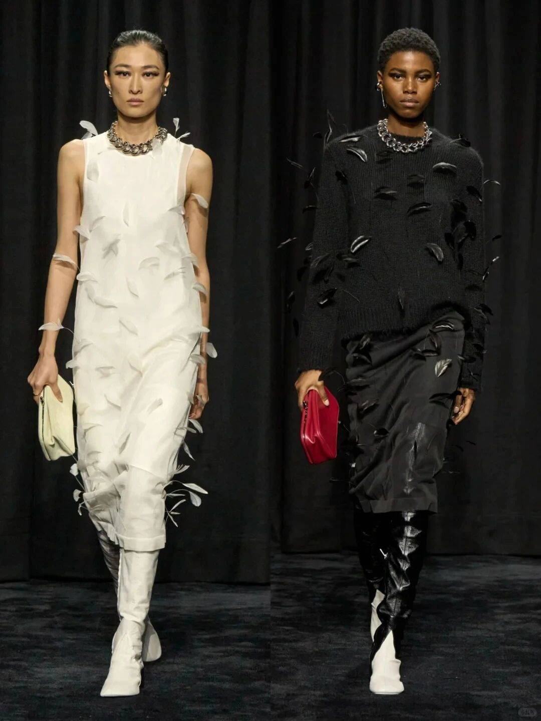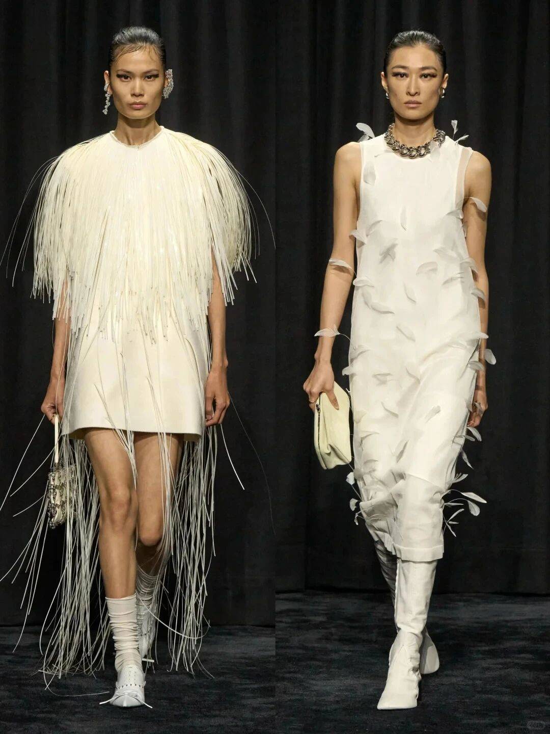 单色系叠加(如灰阶、米棕)营造静谧力量,亮片/羽毛局部点睛