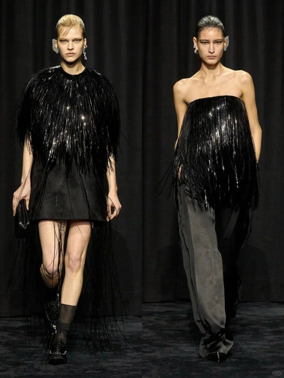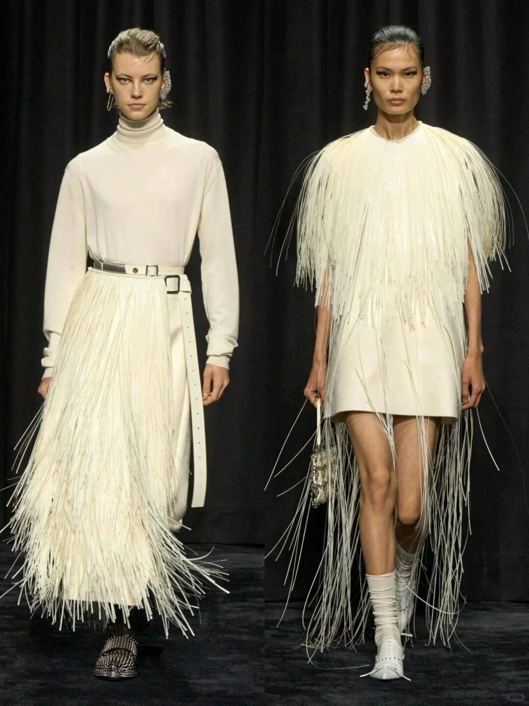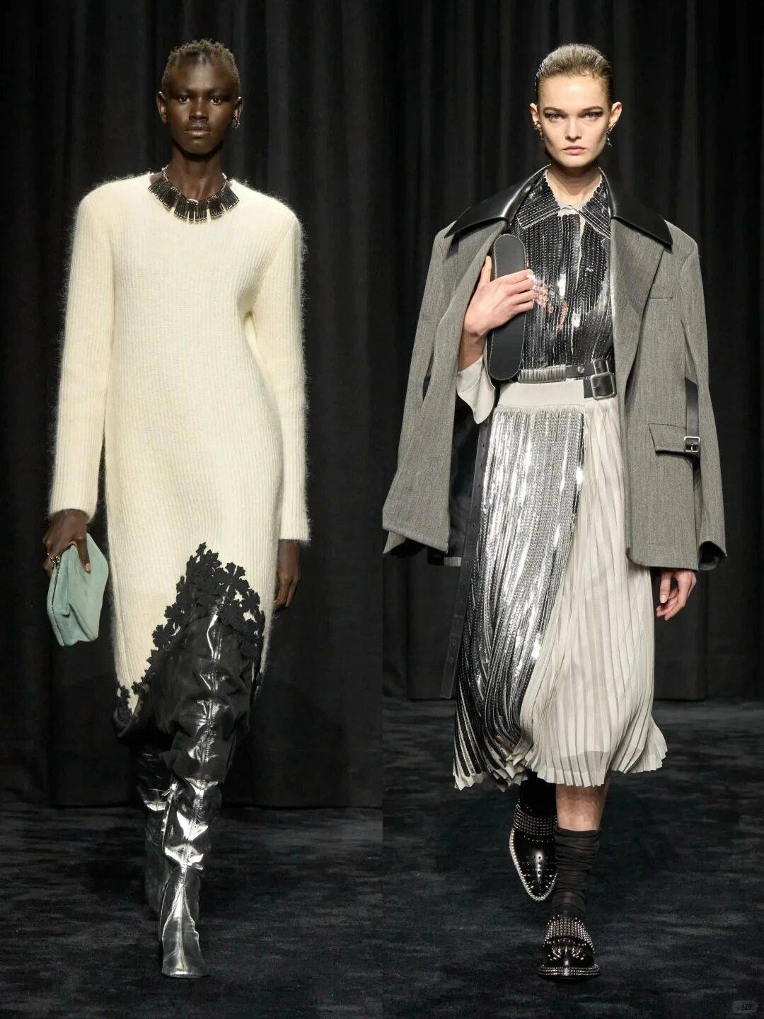 单色系叠加(如灰阶、米棕)营造静谧力量,亮片/羽毛局部点睛