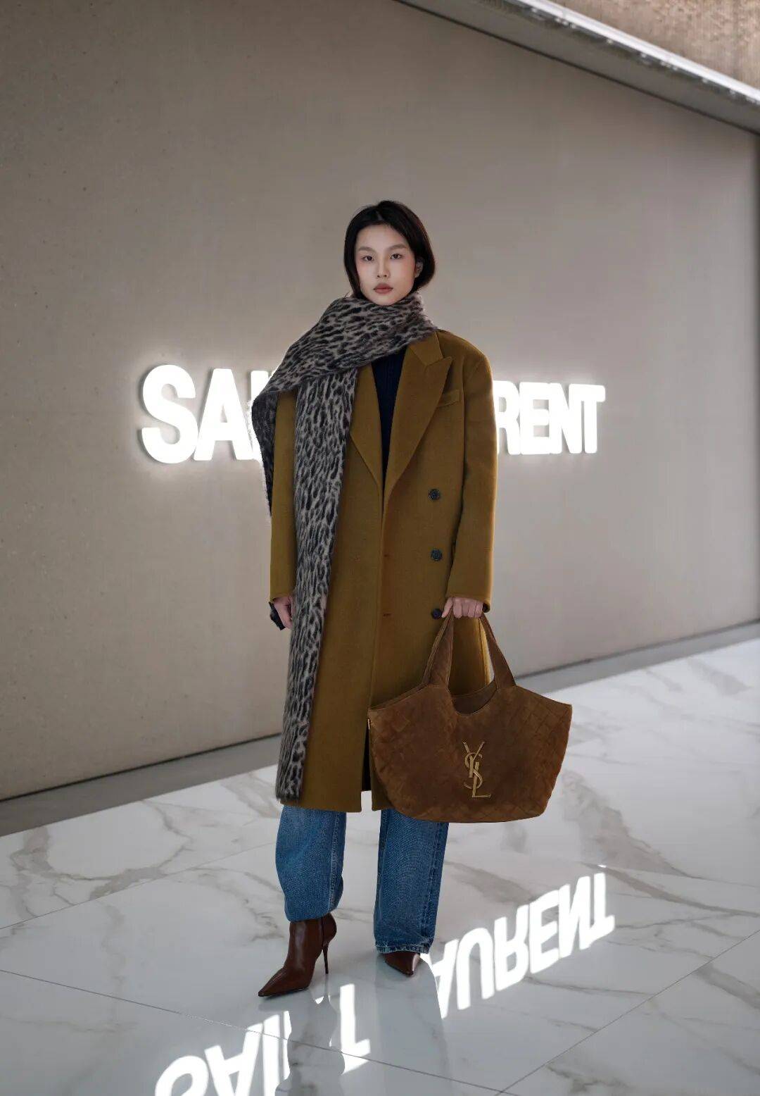 细腰带收紧腰线,玉石胸针点缀文化细节