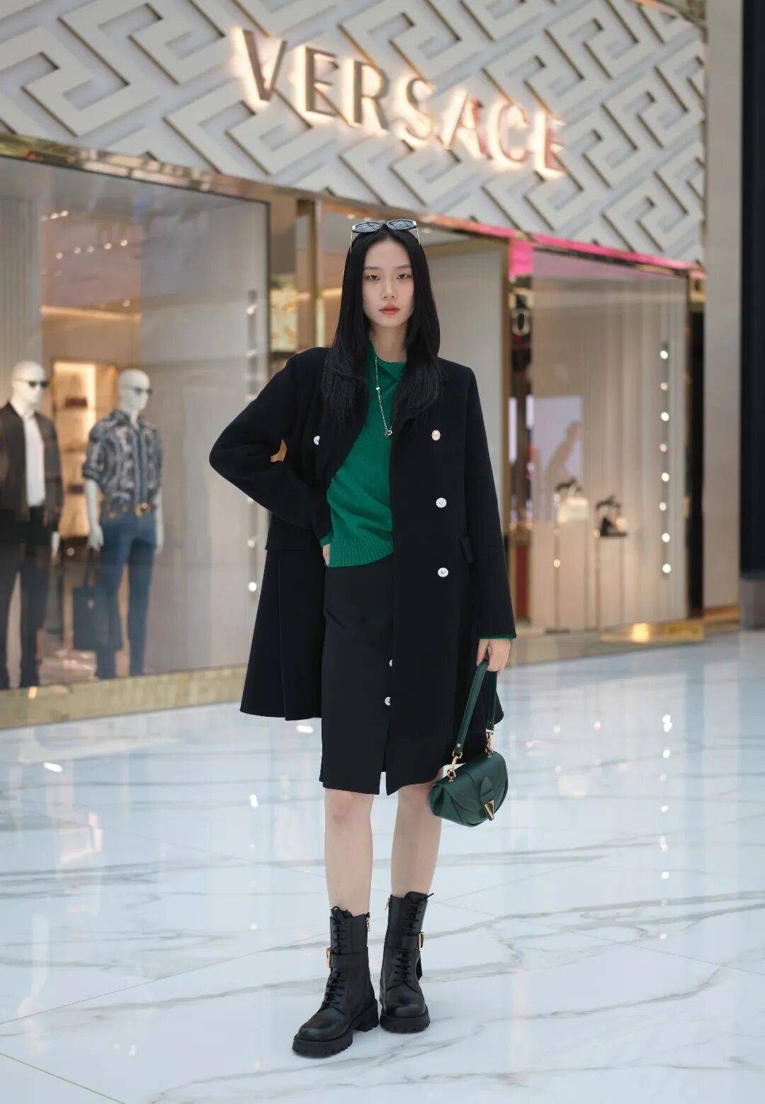 同色系缎面半裙平衡硬朗线条,行走间流动光泽提升精致度