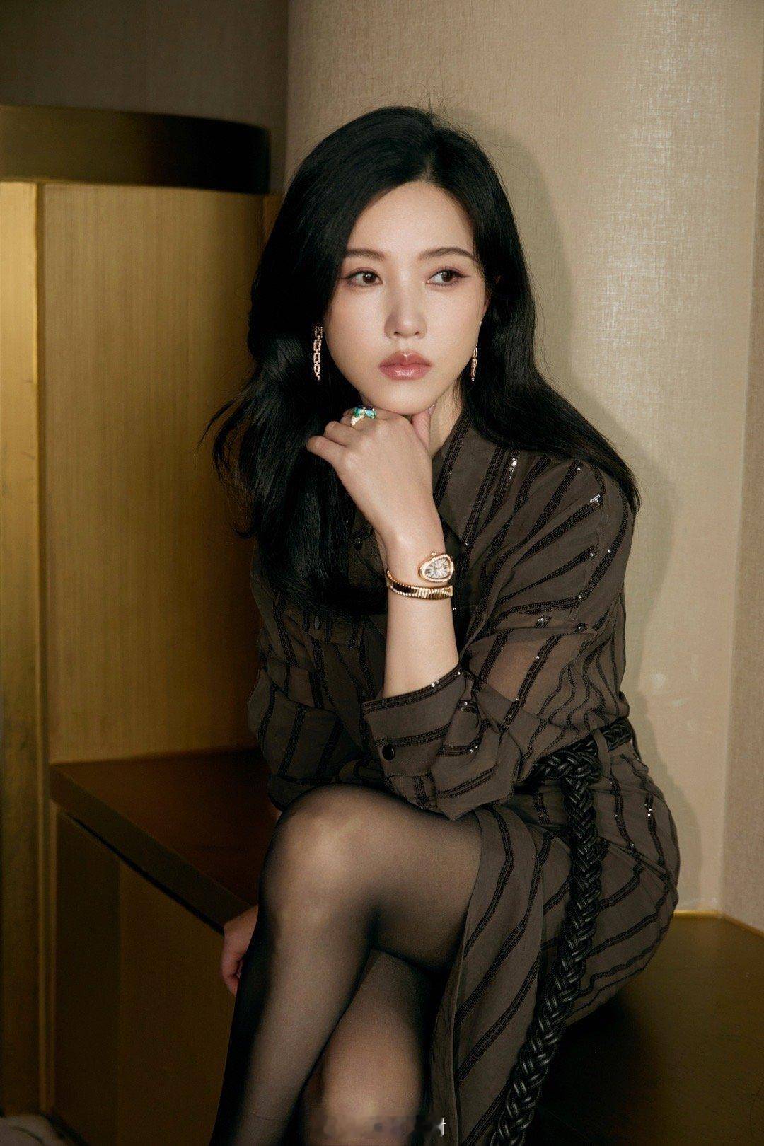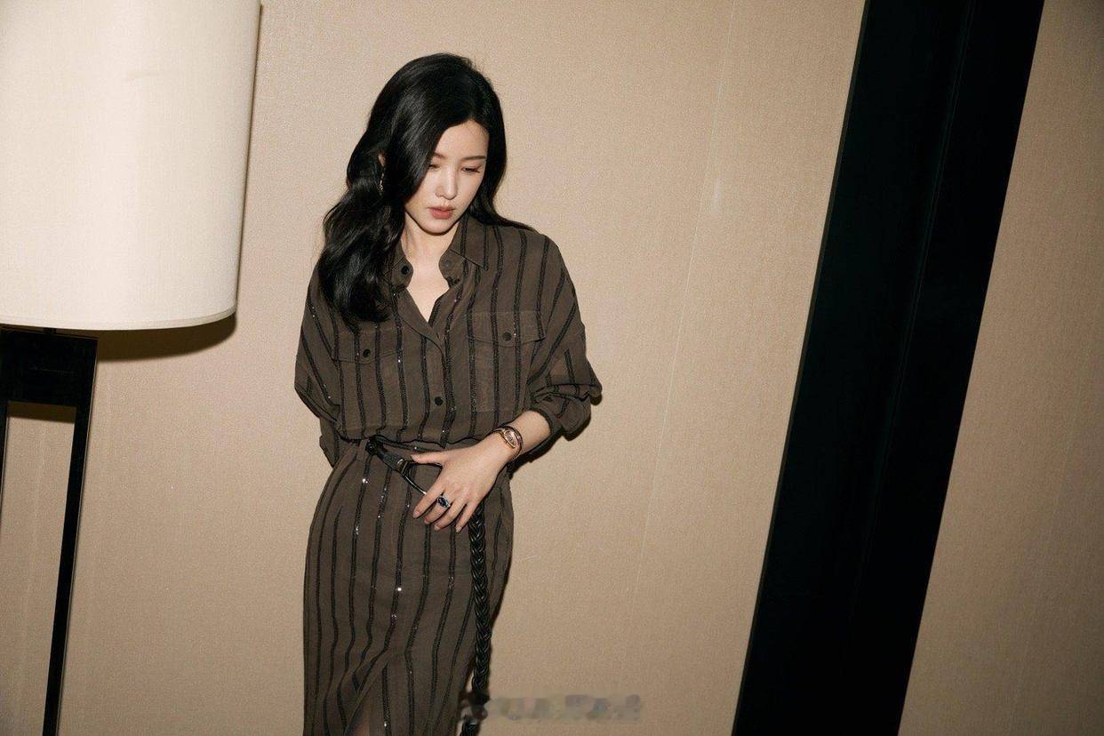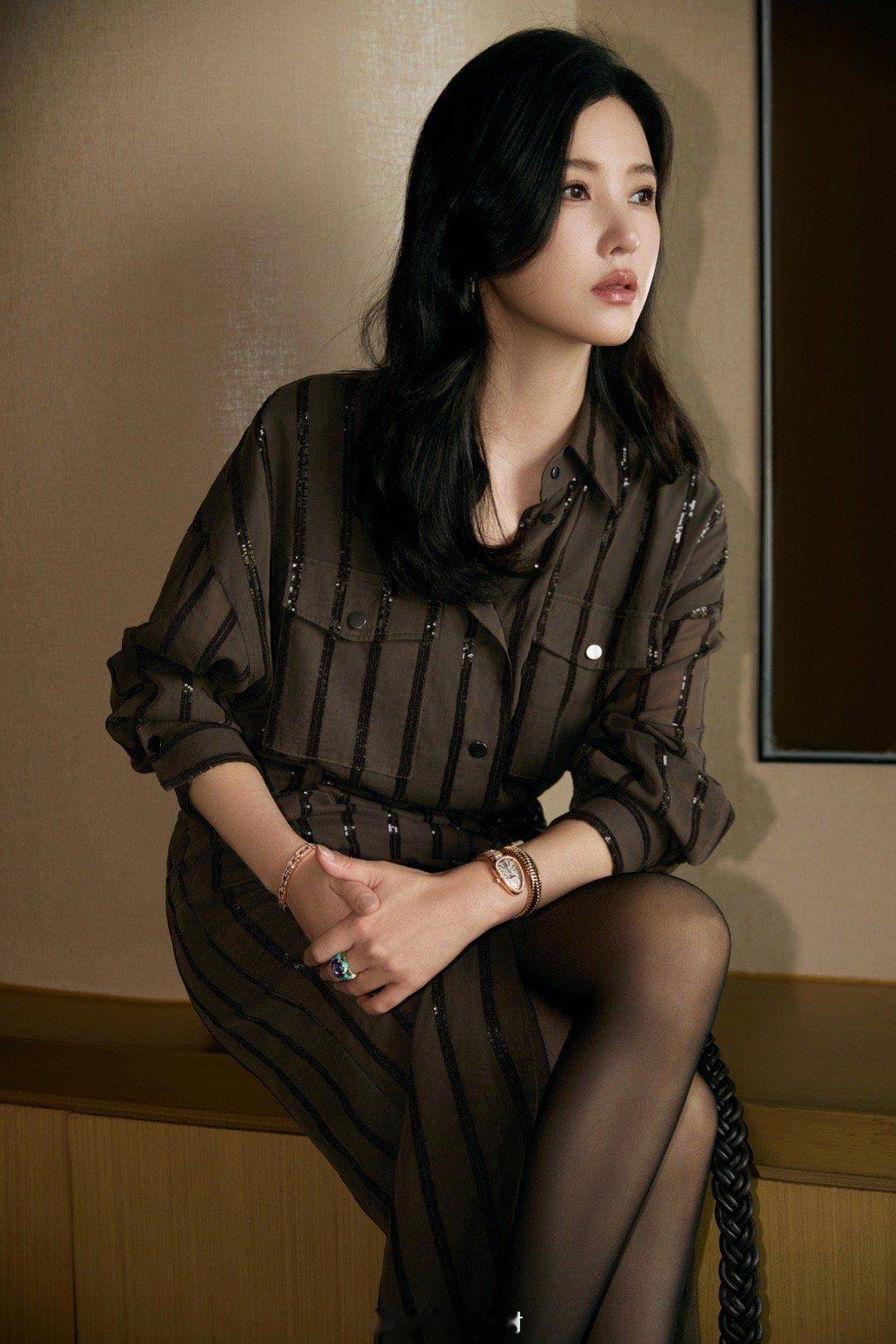 • 她穿着深棕色条纹衬衫裙,裙身带有亮片 / 珠片装饰(属于 “重工设计”),风格是轻熟优雅,搭配黑丝与精致珠宝(腕表、彩宝戒指),细节显贵气;