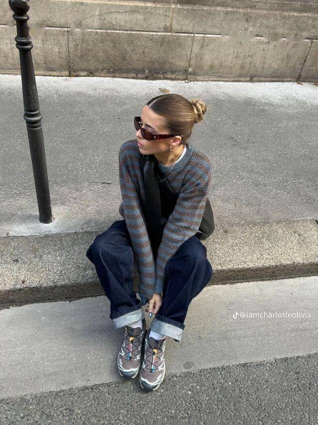 鞋身上的灰色,和毛衣上的条纹呼应,不需要用力过猛的搭配,就能掌握统一性。