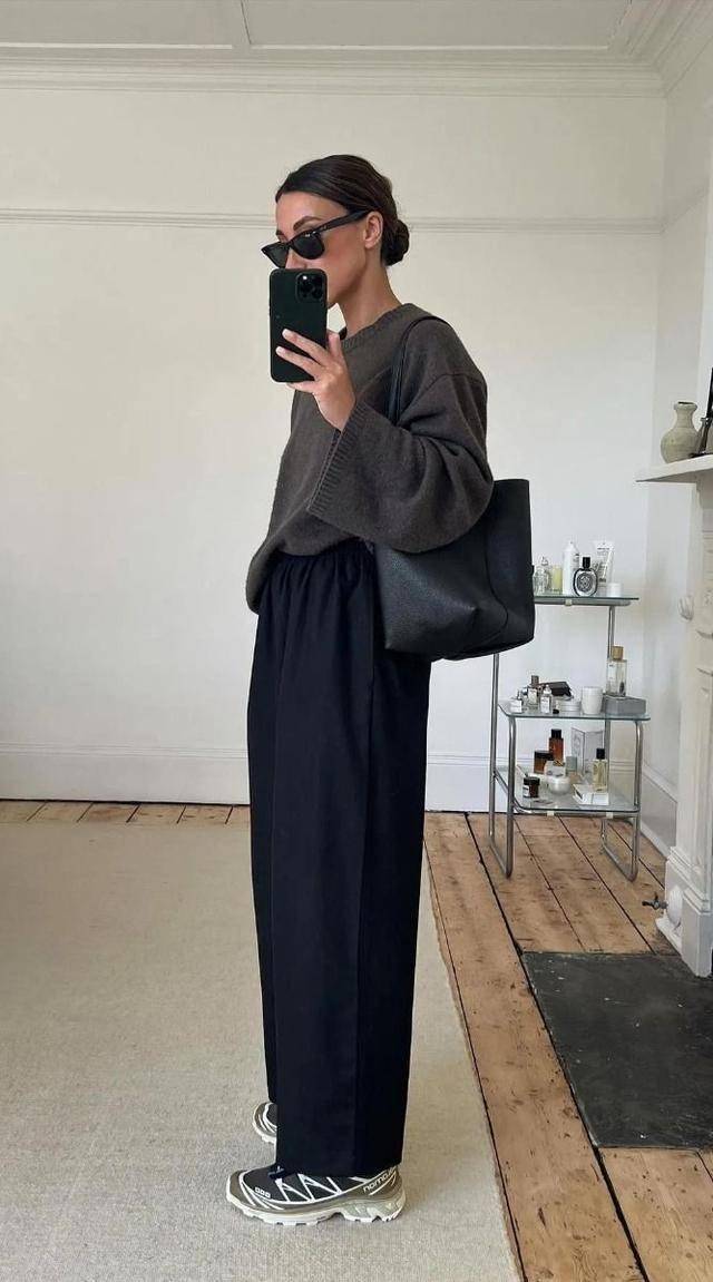 偏爱简约风,深灰色套头毛衣配黑色阔腿裤,更能满足你的需求,再踩双黑白拼色的老爹鞋,打破沉闷感。