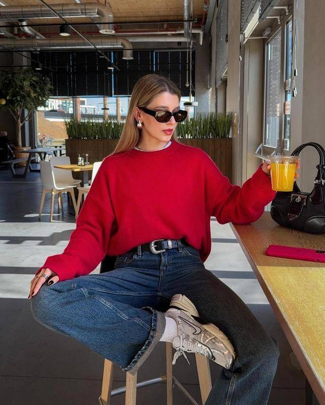 款式越基础,配色越出彩,当红色毛衣出现,就能让我们的生活更有趣,经典款的牛仔裤和老爹鞋,又能削弱张扬感。